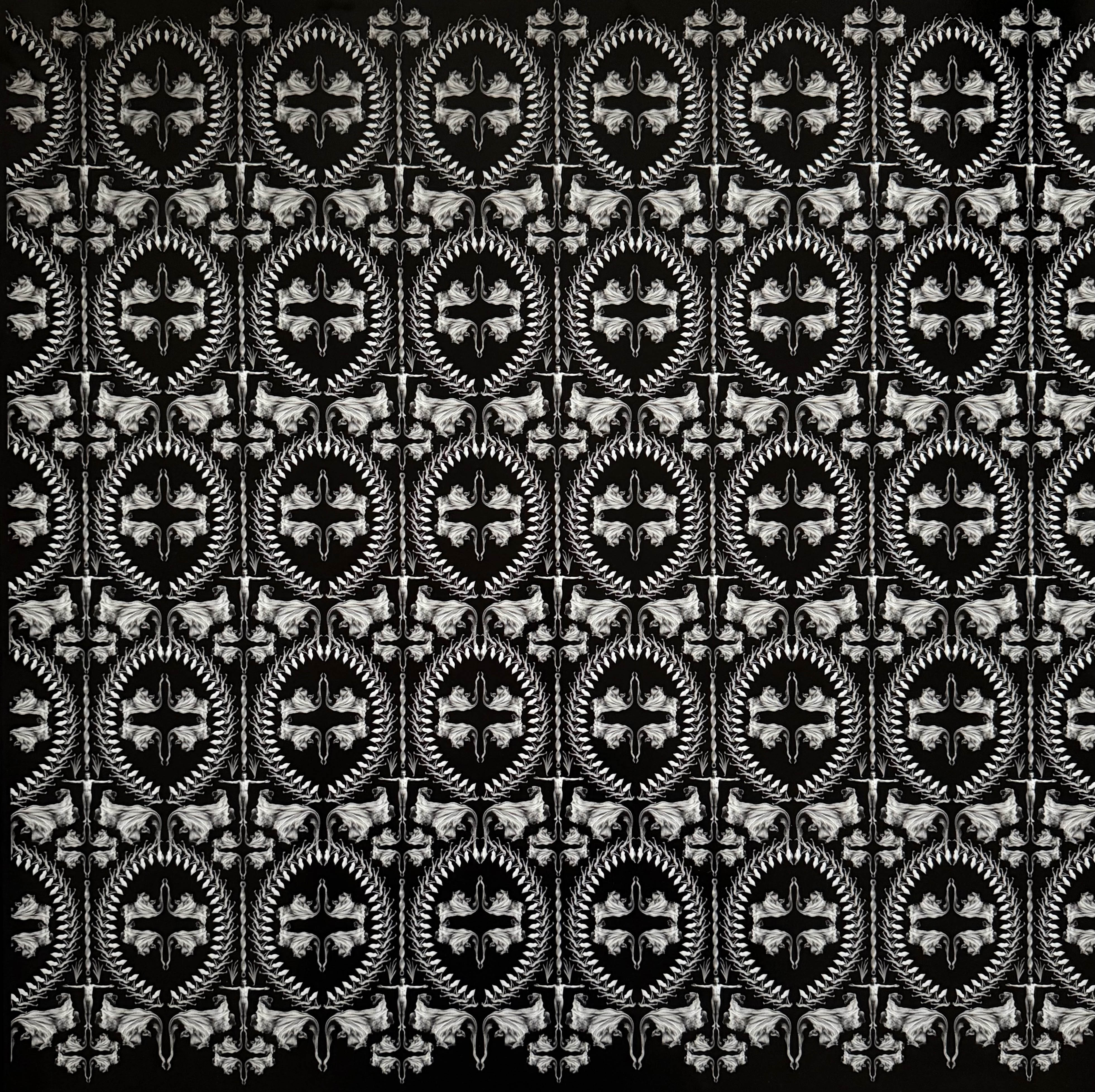 Praca pochodzi z Teki "Desenie" z 2007 r., limitowanej do 35 egz., zawierającej 9 wybranych dzieł o wymiarach 51 x 51 cm, numerowanych i sygnowanych. Wykonana techniką archival pigment print na papierze barytowym przystosowanym do druku pigmentowago najwyższej jakości; numerowana i sygnowana.Ornament — jak podkreśla Zofia Kulik — nie jest przypadkowym układem elementów, lecz wizualną strukturą, która wymaga wyznaczenia reguł, nim zacznie się powielać. Raz ustalony porządek geometryczny prowadzi wzór dalej, pozwala mu się rozrastać i rytmicznie multiplikować. Na podobnej zasadzie funkcjonuje teka „Desenie", przypominająca zbiór próbek materiałów czy wzornik, lecz będąca równocześnie refleksją nad przetwarzaniem obrazu i historią jego form. Kulik buduje tu własne ornamenty, oparte na wzorach zaczerpniętych z różnych tradycji i epok.W "Deseniu 5" według projektu kwiatowej tkaniny Morrisa, postaci z flagą układają się ażurowym wzorem w formy medalionów. W polu ornamentu pojawiają się powracające znaki i przedmioty znane z twórczości Kulik: motywy roślinne i organiczne, ostrza i zwieńczenia przypominające akcesoria ceremonialne, fragmenty roślin czy symboliczne obiekty. Obok nich pojawia się postać ludzka, która pełni rolę podstawowego modułu kompozycyjnego — elementu, z którego buduje się strukturę całości. Postać ta pochodzi z "Archiwum Gestów" powstałego w latach 1987-91 prywatnego archiwum artystki, obejmującego setki czarno-białych fotografii mężczyzny pozującego w układach wymyślonych i reżyserowanych przez Kulik.
