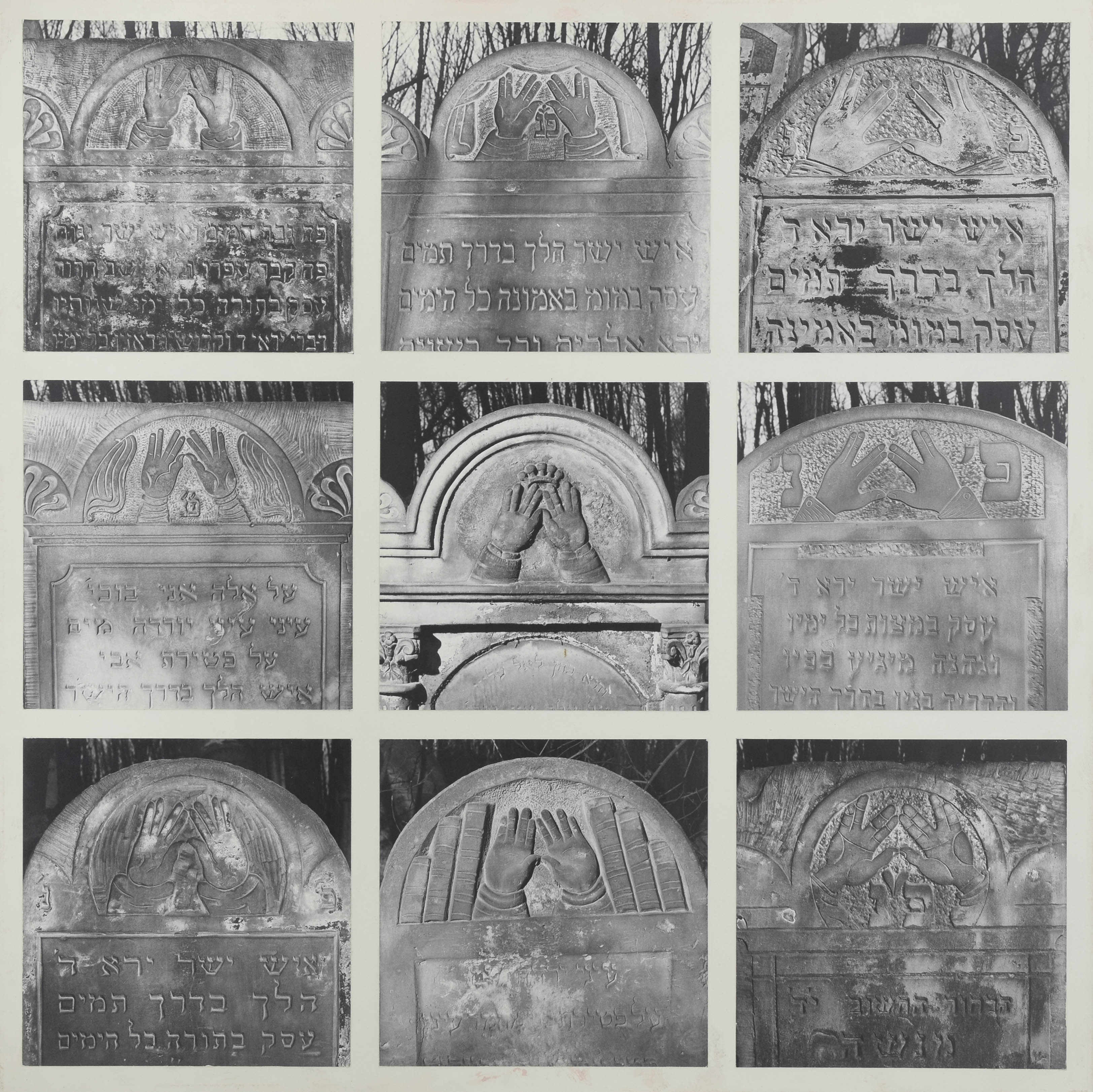 fotografia naklejona na blachę aluminiową zaklejoną papierem; 60 x 60 cm; 18 x 18 cm (wymiar każdej z 9 fotografii); sygn., dat. i opisana na odwrocie: Zbigniew Dłubak / "Desymbolizacje I" / ręce błogosławiące / 1978 (ołówkiem).