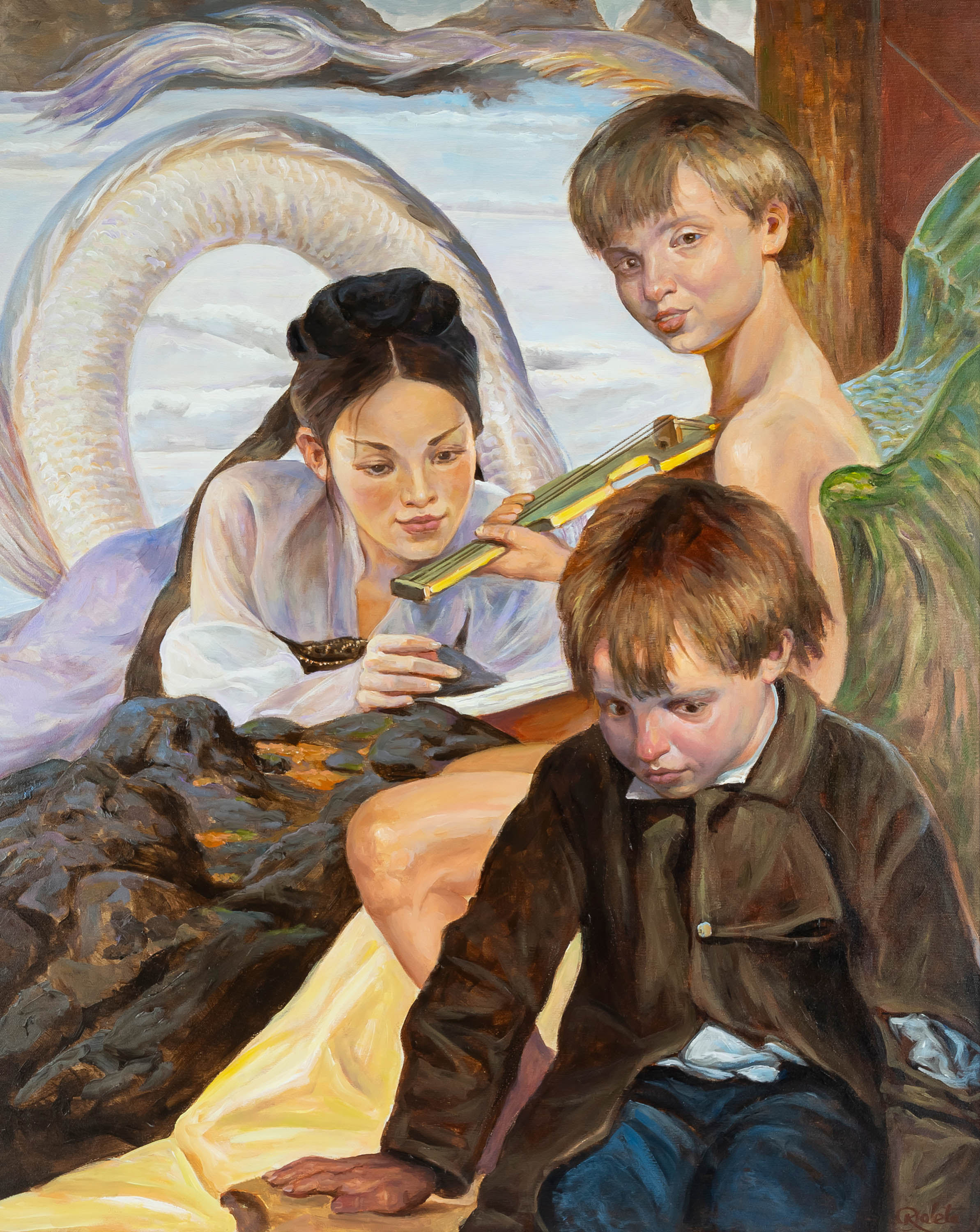 akryl, płótno, 100 x 80 cm, sygn. p.d.: DKaleta, na odwrocie opisany, sygn. i dat.: "Dialog z Malczewskim - II" / akryl 100/80 cm / mal. DKaleta / (inspiracja: obraz J. Malczewskiego pt. "Madonna i dzieci" 1897r.)