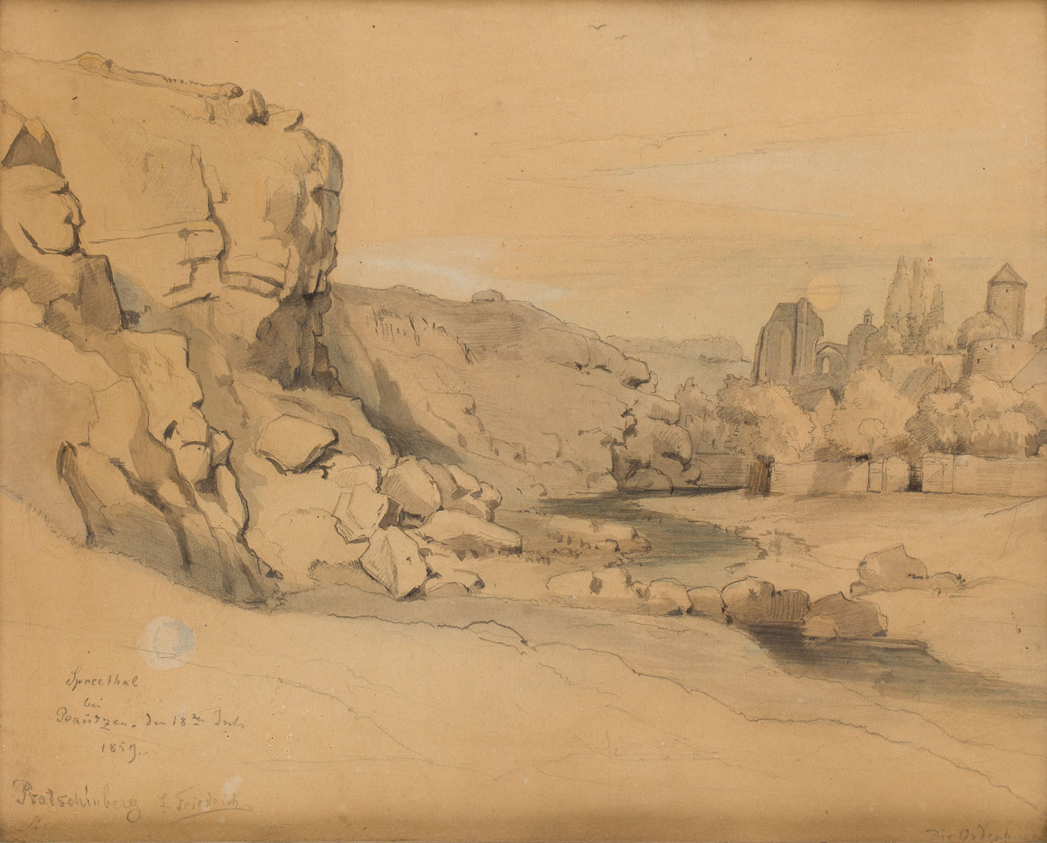 akwarela, ołówek, tusz/papier, 20 x 24,5 cm sygnowany, datowny i opisany l.d.: Spreethal | bei | Poantzen den 18en Juli | 1859 | Protschinberg L. Frierdrich' opisany p.d.: 'Die Ortenburg'