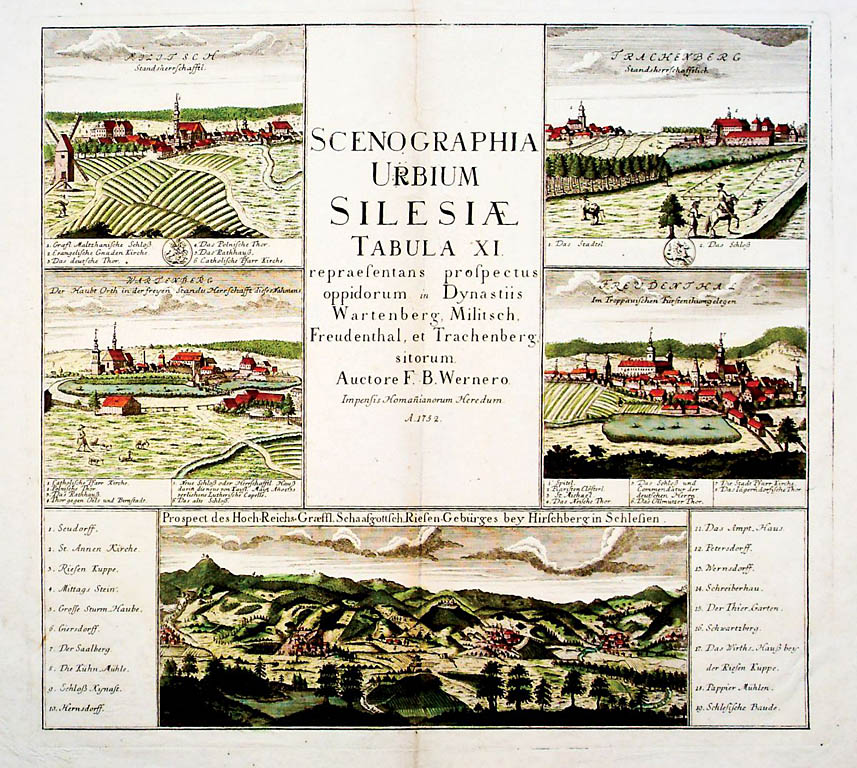 Tablica z widokami miast: Milicz - Militsch, Żmigród - Trachenberg, Syców - Wartenberg, Bruntal (Bruntál w Czechach) - Freudenthal, Karkonosze - Prospect des Hoch=Reichs=Graeffl. Schaafgottsch. Riesen=Gebürges bey Hirschberg in Schlesien; według rys. F.B. Wernera, XI tablica z: Scenographia Urbium Silesiae, wyd. Oficyna Spadkobierców Homanna, Norymberga 1752; miedz. kolor., st. bdb., zażółcenia na złożeniu; wymiar płyty: 490x450 mm; Scenographia Urbium Silesiae. Tabula XI...; [Imago Silesiae... 265]