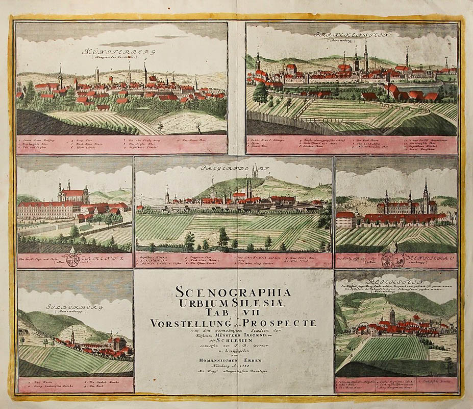 Tablica z widokami Ziębic (Münsterberg), Ząbkowic Śląskich (Frankenstein), klasztoru w Kamieńcu Ząbkowickim (Camentz), Karniowa, dziś Krnov w Czechach (Jaegerndorf), klasztoru w Henrykowie (Henrichau), Srebrnej Góry (Silberberg), Złotego Stoku (Reichstein); wg rys. F.B. Wernera; VII tablica z: Scenographia Urbium Silesiae, wyd. Oficyna Spadkobierców Homanna, Norymberga 1738 r.; miedz. kolor., st. bdb., zabrudzenia; wymiary płyty: 583x493 mm; Scenographia Urbium Silesiae. Tab: VII...; [Imago Silesiae... 261]