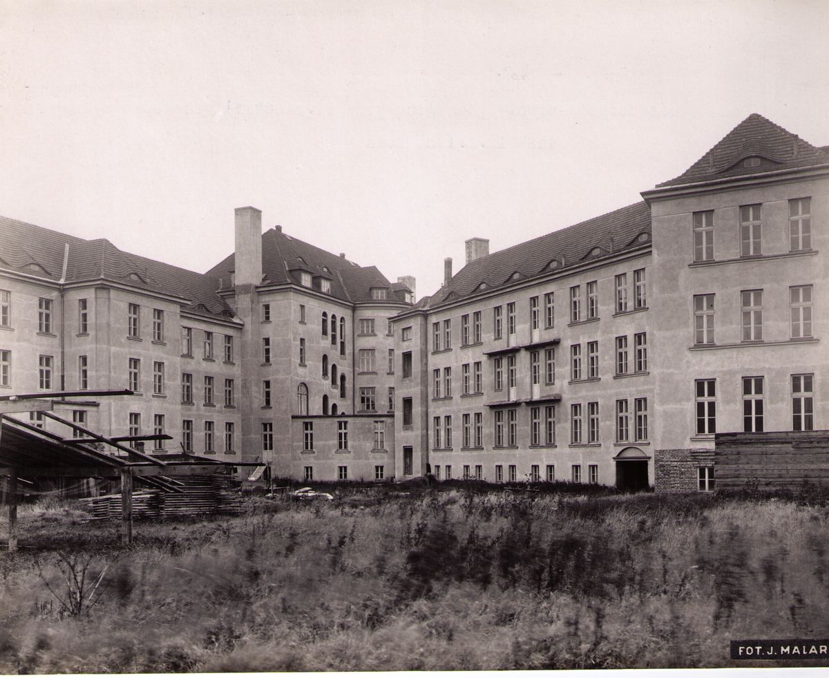 Na odwrocie stempel: Agencja Fotograficzno-Prasowa / Jan Malarski / Chmielna 10, tel. 224-20 / Prawo reprodukcji zastrzeżone; maszynopis: Dom Opieki dla opuszczonych dzieci żydowskich przy ul. Płockiej / elewacja tylna/ Dnia 13.X.1930 roku