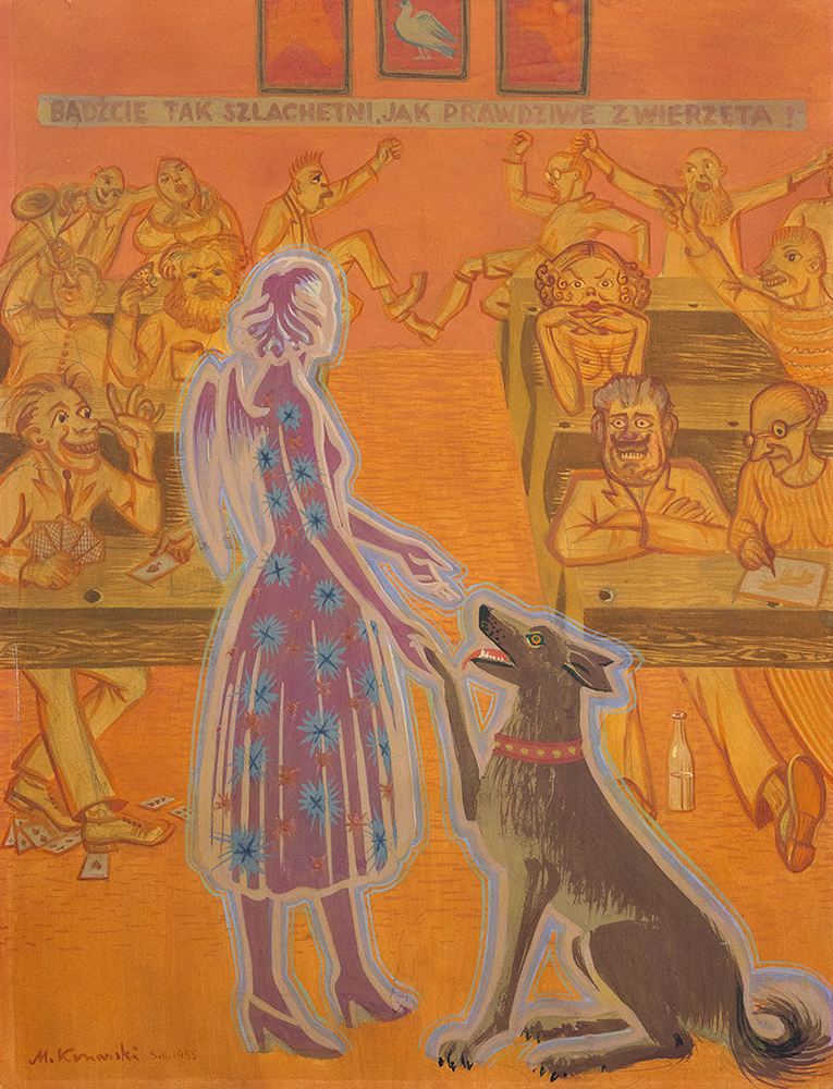 akwarela/papier, 50 x 38,4 cm (w świetle passe-partout)sygnowany l.d.: M.Konarskiopisanydługopisem na odwrocie oprawy: Marian 'Marzyn' Konarski | " Dozwierzęcenie ludzi " | 1955