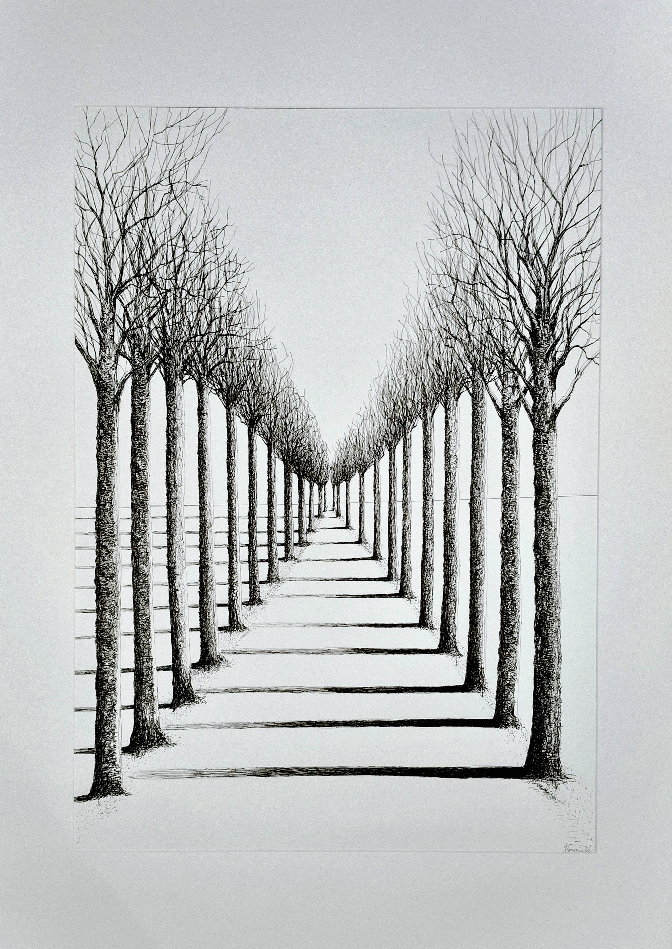 cienkopis, papier, 70 x 50 cm, w oprawie: 100 x 70 cm,