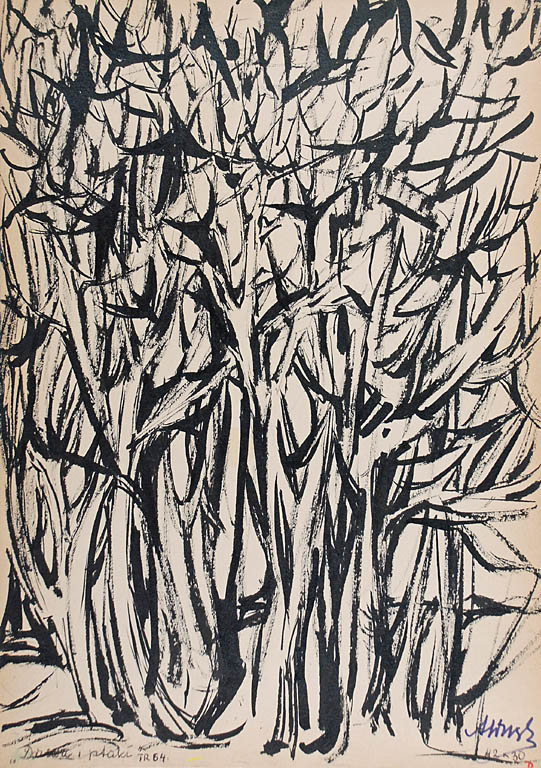 tusz, karton, 42 x 29,5 cm;sygn. p. d.: AWnęk / 42 x 30 / D;tytuł l. d.: "Drzewa i ptaki" / TR 64;Na odwrocie opis autorski