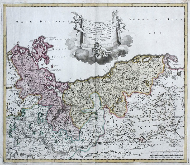 Mapa Księstwa Pomorskiego, przeróbka mapy Pomorza Fredericka de Wita, Amsterdam 1696 r.; miedzioryt kolorowany, wym. 50 x 58 cm (odcisk płyty); naprawione 2 niewielkie rozdarcia na lewym marginesie