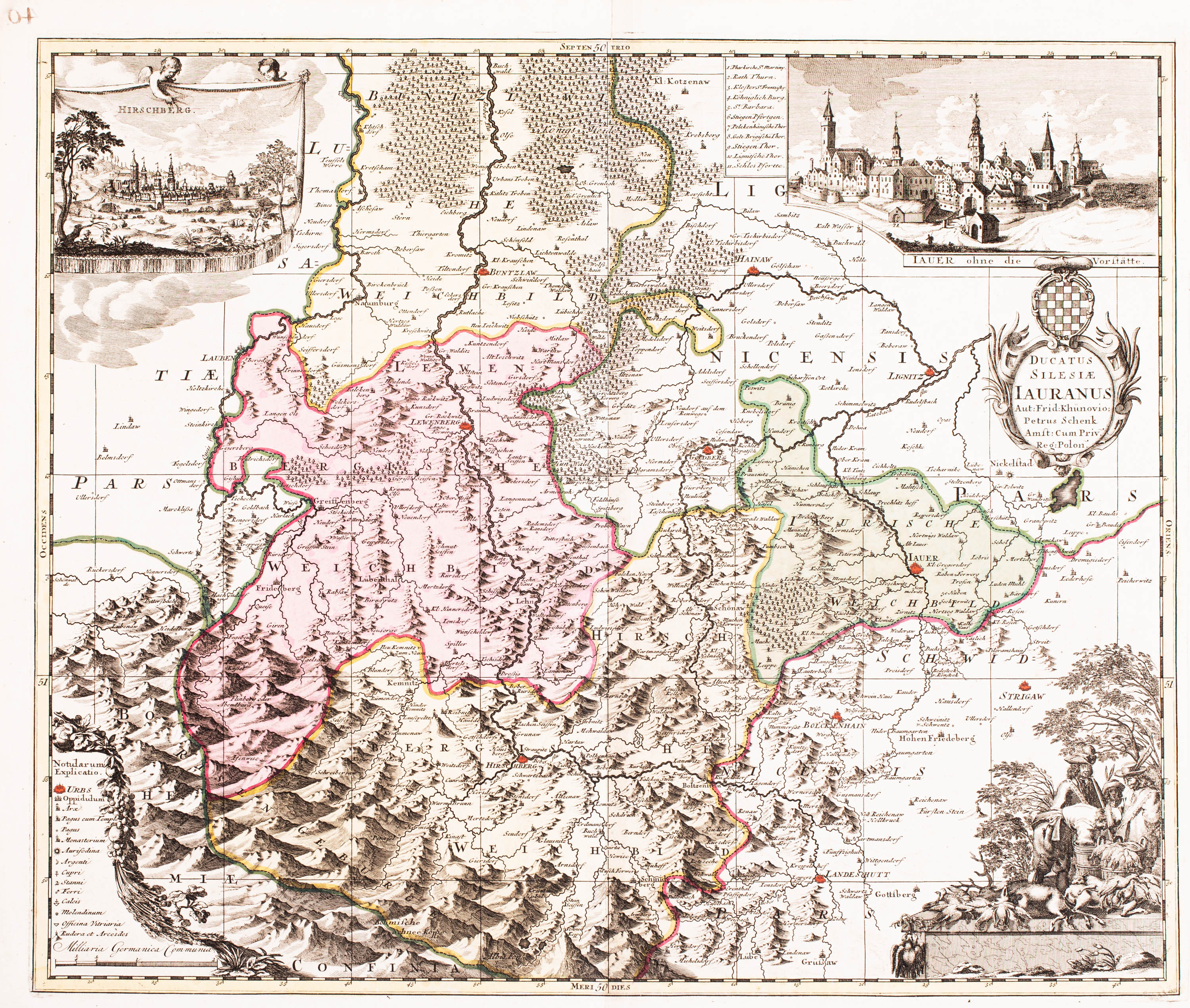Mapa Księstwa świdnicko-jaworskiego, Amsterdam, ok. 1700; w narożnikach widoki Jeleniej Góry i Jaworamiedzioryt kolorowany w epoce, 49 x 58,5 cmstan zachowania bardzo dobry