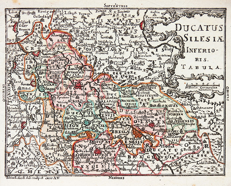 Miniaturowa mapa Śląska, pochodząca z dzieła "Kurzgefasste Geographie... ", wyd. J. M. Wagner, Augsburg, 1762 r., miedzioryt kolorowany, wym. arkusza 10,5 x 13,5 cm