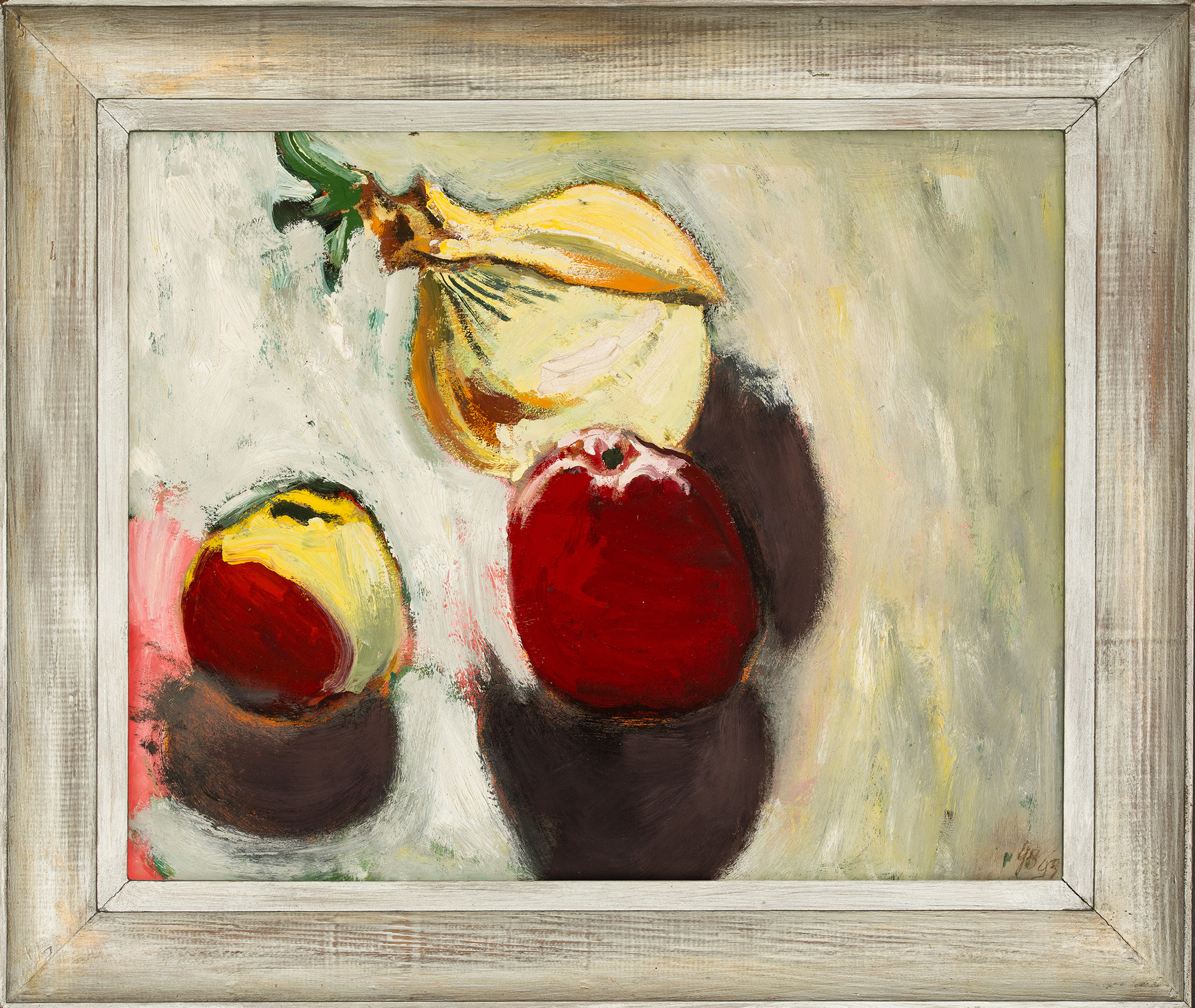 olej na tekturze, 1993/1994, 40 x 50 cm,sygnowany, datowany i opisany na odwrocie: "DWA JABŁKA I CEBULA | ol. | tektura | 40 x 50 | G. BEDNARSKI | 1993/94".