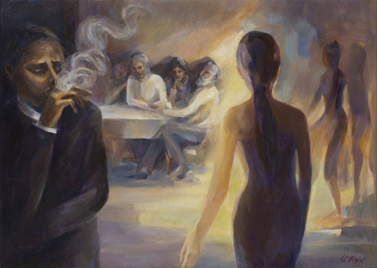 olej, płótno, 50x70 cm, sygn. p.d.: U. Figiel, opisany na odwrocie: URSZULA FIGIEL "Dym z papierosa" (olej 50x70) 2020 r. Urszula Figiel