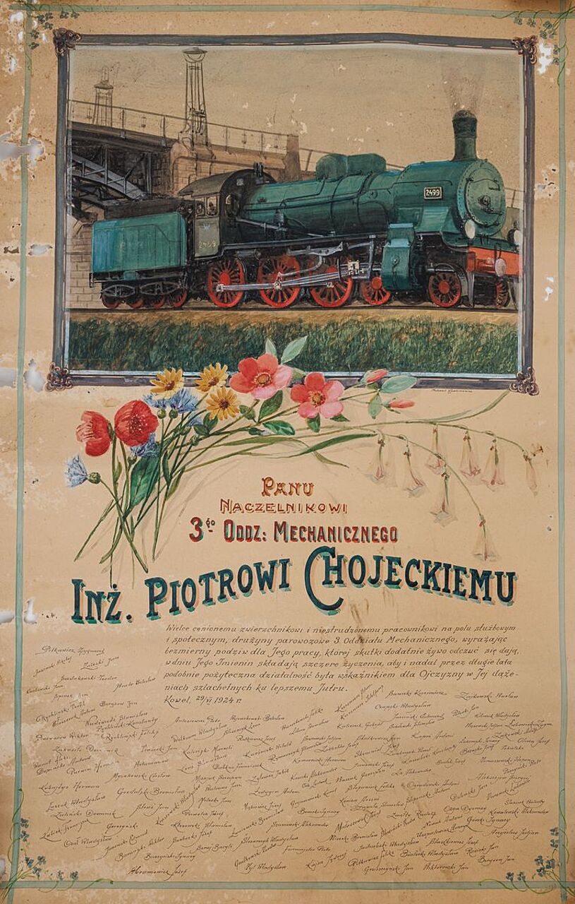Panu naczelnikowi 3go Oddz. Mechanicznego inż. Piotrowi Chojeckiemu. Wielce cenionemu zwierzchnikowi i niestrudzonemu pracownikowi na polu służbowym i społecznym, drużyny parowozowe 3 Oddziału mechanicznego, wyrażające bezmierny podziw dla jego pracy, której skutki dodatnie żywo odczuć się dają w dniu Jego Imienin składają szczere życzenia, aby nadal przez długie lata podobnie pożyteczna działalność była wskaźnikiem dla Ojczyzny w jej dążeniach szlachetnych ku lepszemu Jutru. Kowel 29 VI 1924; kilkadziesiąt podpisów