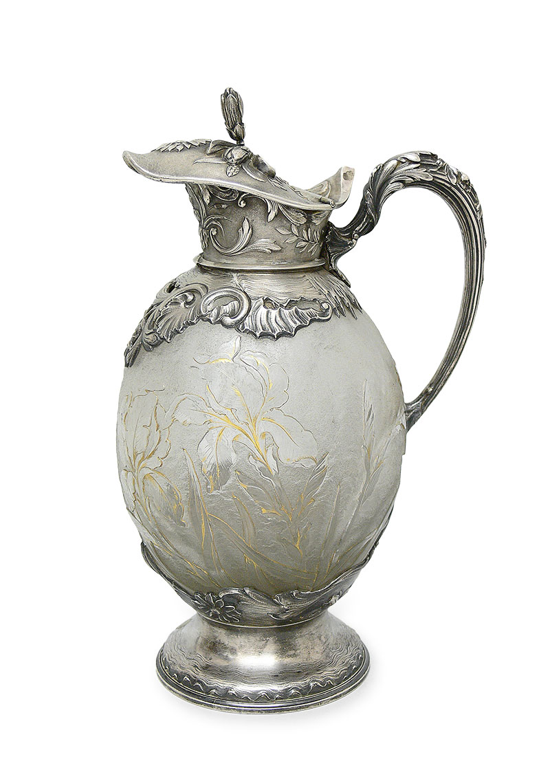 Daum Frères, Nancy, l. 90. XIX w. szkło bezbarwne, trawione, cyzelowane, malowane złotem, okucie srebrne; dekoracja w postaci irysów; sygnatura malowana na spodzie: Daum Nancy i krzyż lotaryński; wys. 27,5 cm