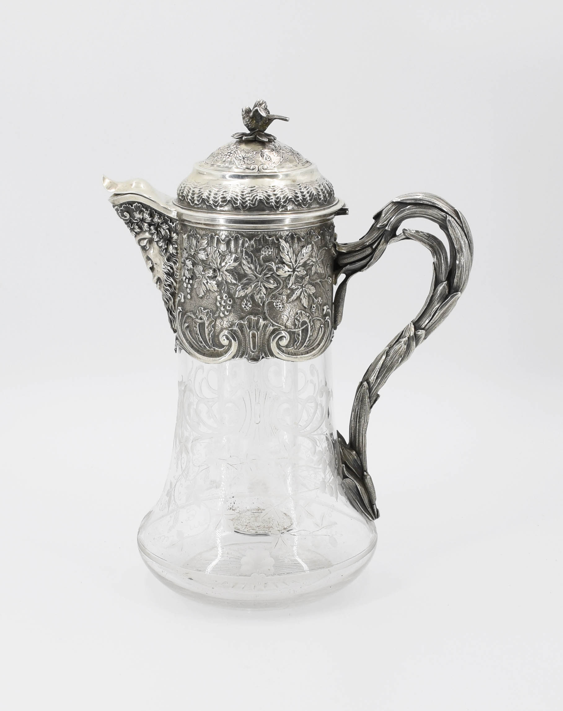 Dzban szklany na planie koła, u dołu wydęty, wyżej stożkowaty, bogato zdobiony grawerowanym ornamentem floralnym z wici winorośli z gronami, wolut i palmet, wśród których przedstawiona en face głowa satyra; z boku odlane ze srebra ucho skomponowane z lancetowatych liści i pałek wodnych; szyja okuta w srebro z reliefowymi liśćmi winorośli, z wylewem trójkątnym, umieszczonym wysoko zdobionym głową satyra z długą brodą w wieńcu z winorośli; nakrywka srebrna, kopulasta, na zawiasie, ozdobiona motywem fali oraz grawerowaną winną łozą; w zwieńczeniu pełnoplastyczny ptaszek.