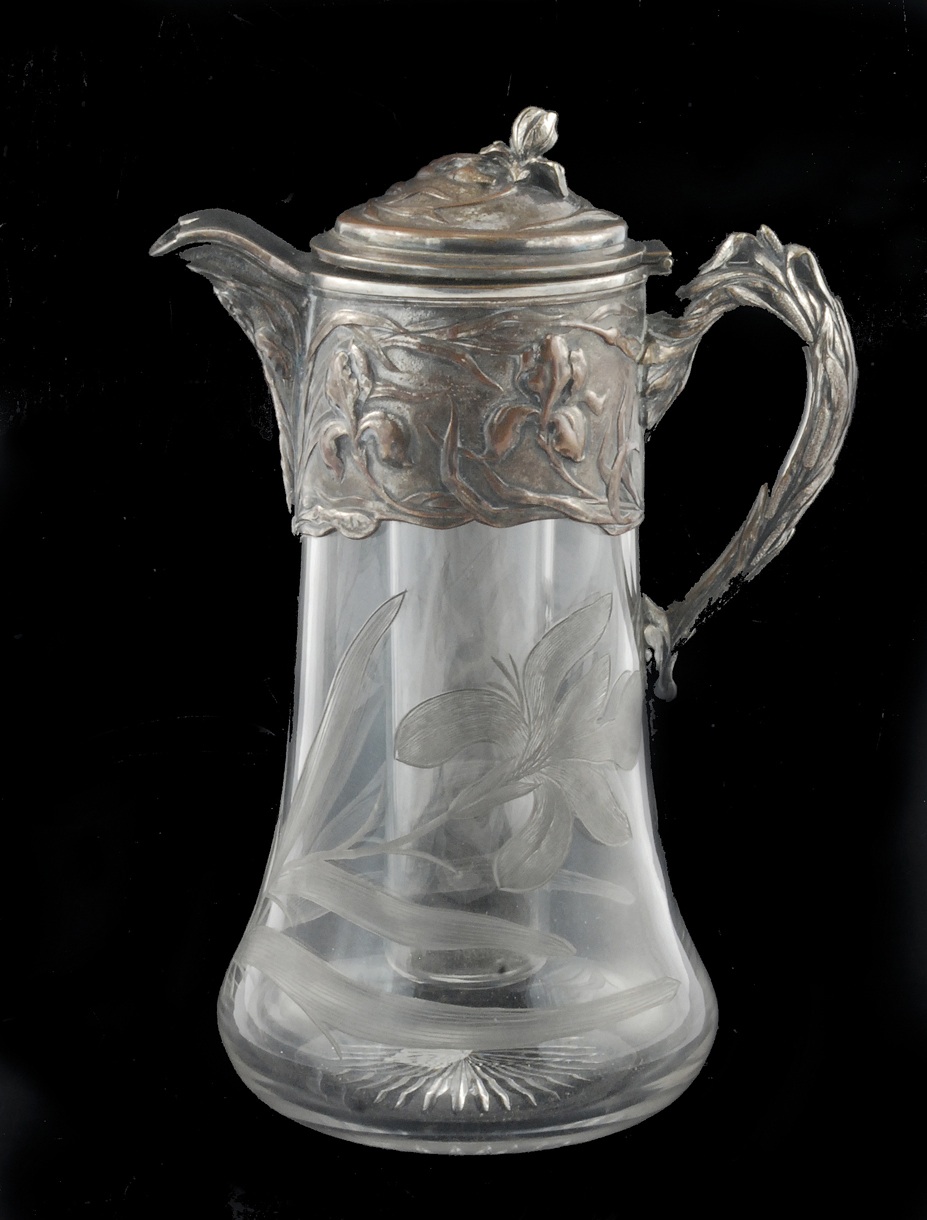 Ze szkła szlifowanego dekorowanego irysami, z cylindryczną wkładką na lód, okutego w plater zdobiony motywami reliefowych irysów i pałek wodnych, z ceowatym uchem i nakrywką na zawiasie zwieńczoną pąkiem