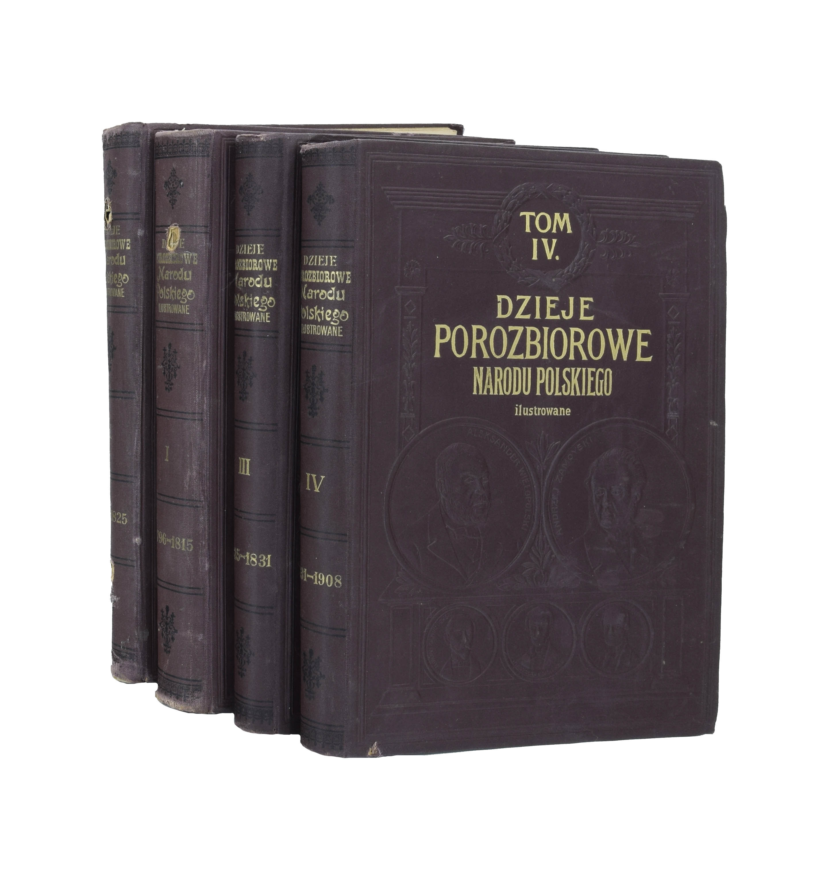 Komplet wydawniczy. Monumentalna praca opisująca dzieje Polski od r. 1795 do 1908 r. Tomy zawierają po kilkaset ilustracji (portrety, widoki miast, sceny historyczne i rodzajowe, podobizny medali, faksymile dokumentów, mundury) czarno-białych oraz kolorowe rozkładane plansze przedstawiające umundurowanie polskich wojsk.