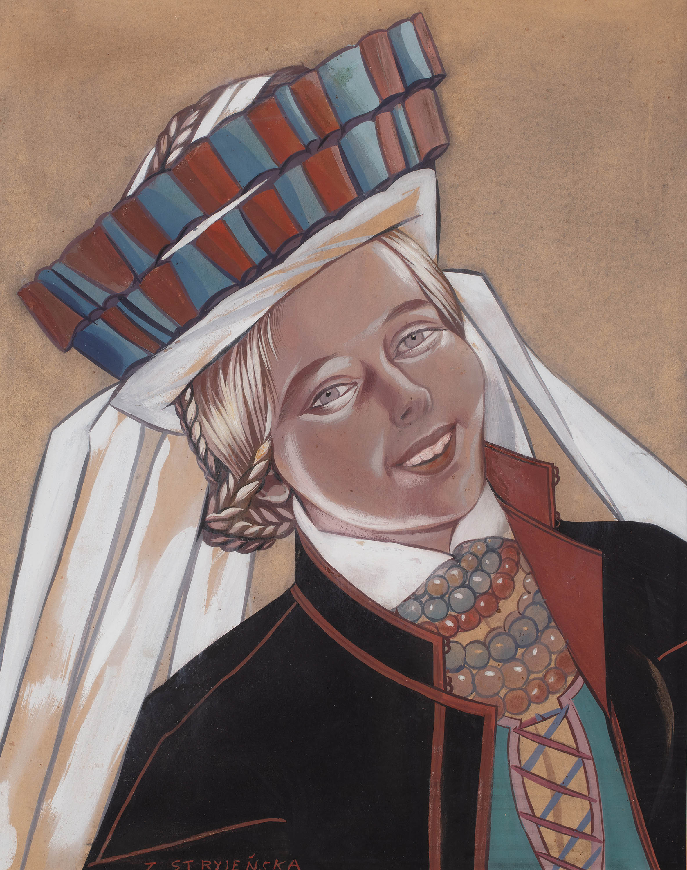 Prezentowana praca nawiązuje do jednej z plansz z teki „Polish Peasants’ Costumes” z 1939 roku, wydanej w Nicei w 1939 roku. Plansza ta, numer XXXIII przedstawia postać „Chłopki z okolic Lublina” w stroju ludowym. „Postacie wykreowane przez Stryjeńską są niemal zawsze ubrane bogato i strojnie, z pańska, choć po chłopsku. Przetwarza ona nieraz owe ludowe stroje w sposób niemal fantastyczny, tworząc konstrukty, które nigdy na polskiej wsi nie istniały. Dlatego jej malarskich przedstawień strojów ludowych nie można traktować dosłownie. Artystka nie była „dokumentalistką” życia mieszkańców wsi, jej wiedza o ludowym ubiorze brała się z obserwacji eksponatów muzealnych i wystaw (wyjątek stanowi Podhale, dokąd często podróżowała). Nie kopiowała w sposób dosłowny i zgodny z oryginałem wiejskiego przyodziewku, choć takie jest powszechne przekonanie. Malując postacie w regionalnych strojach, stosowała zasadę dowolnej stylizacji, luźno związanej z rzeczywistością. Podkreślała, często przerysowując i wyolbrzymiając, te cechy, które jej zdaniem były najciekawsze. Przykładem mogą być kompozycje z teki Polish Peasonts’ Costumes [nr kat. V. I.4, s. I 52].” J. Słomska, O ludowości [w:] „Zofia Stryjeńska 1891–1976”, katalo wystawy red. Ś. Lenartowicz, Kraków 2008, s. 263