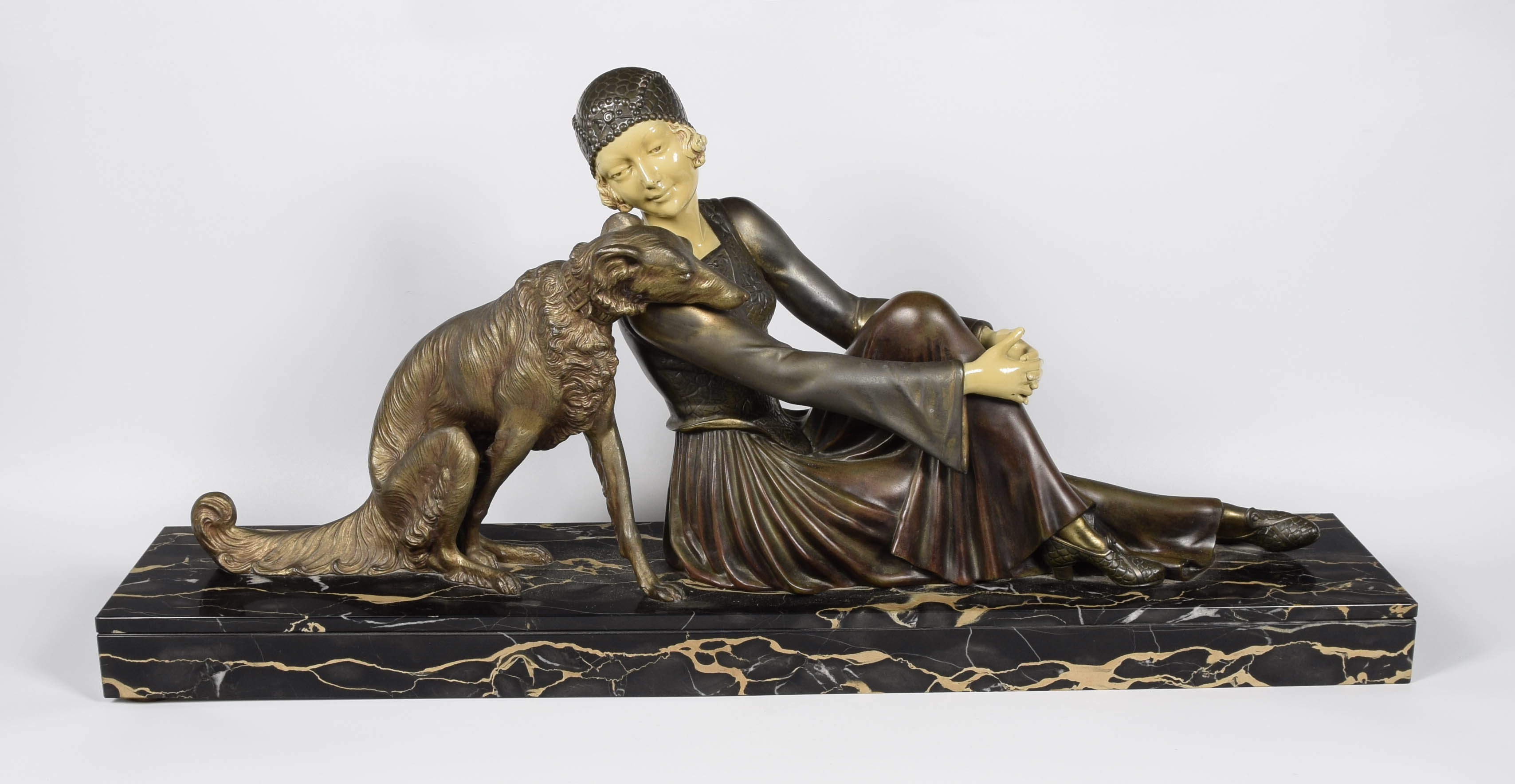 brąz patynowany, częściowo złocony; biała iworyna (dłonie, twarz), podstawa - marmur; wys. 37 cm; dł. 76,35 cm; szer. 16 cm.