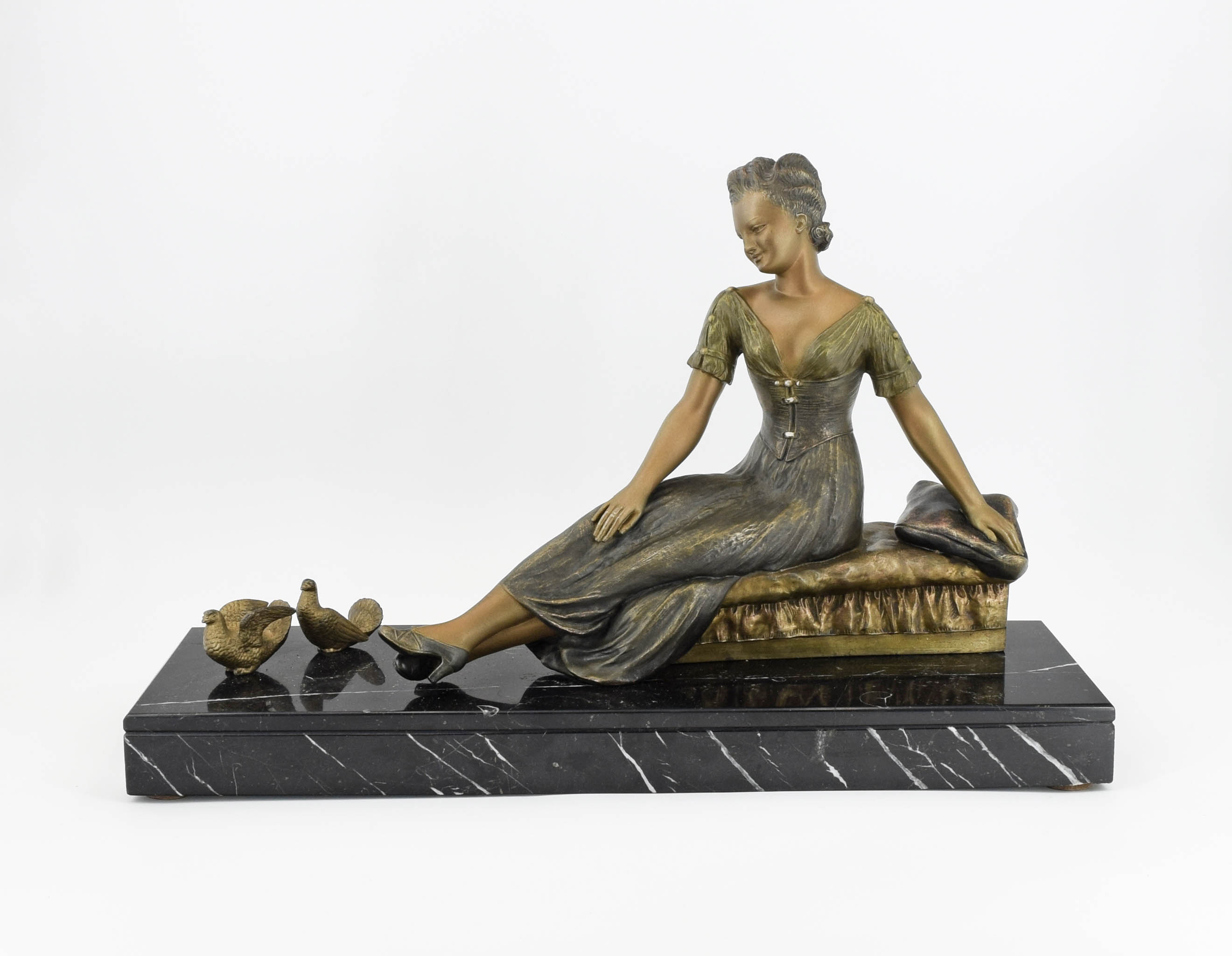 Na wydłużonej, prostokątnej podstawie z czarnego, żyłkowanego marmuru - młoda kobieta w swobodnej pozycji, siedząca na kanapie, w srebrzystej sukni z dekoltem i krótkimi rękawami; buty na obcasie, srebrne, podobnie jak fryzura z krótkich włosów; wpatruje się z uśmiechem w parę siedzących przed nią gołębi.