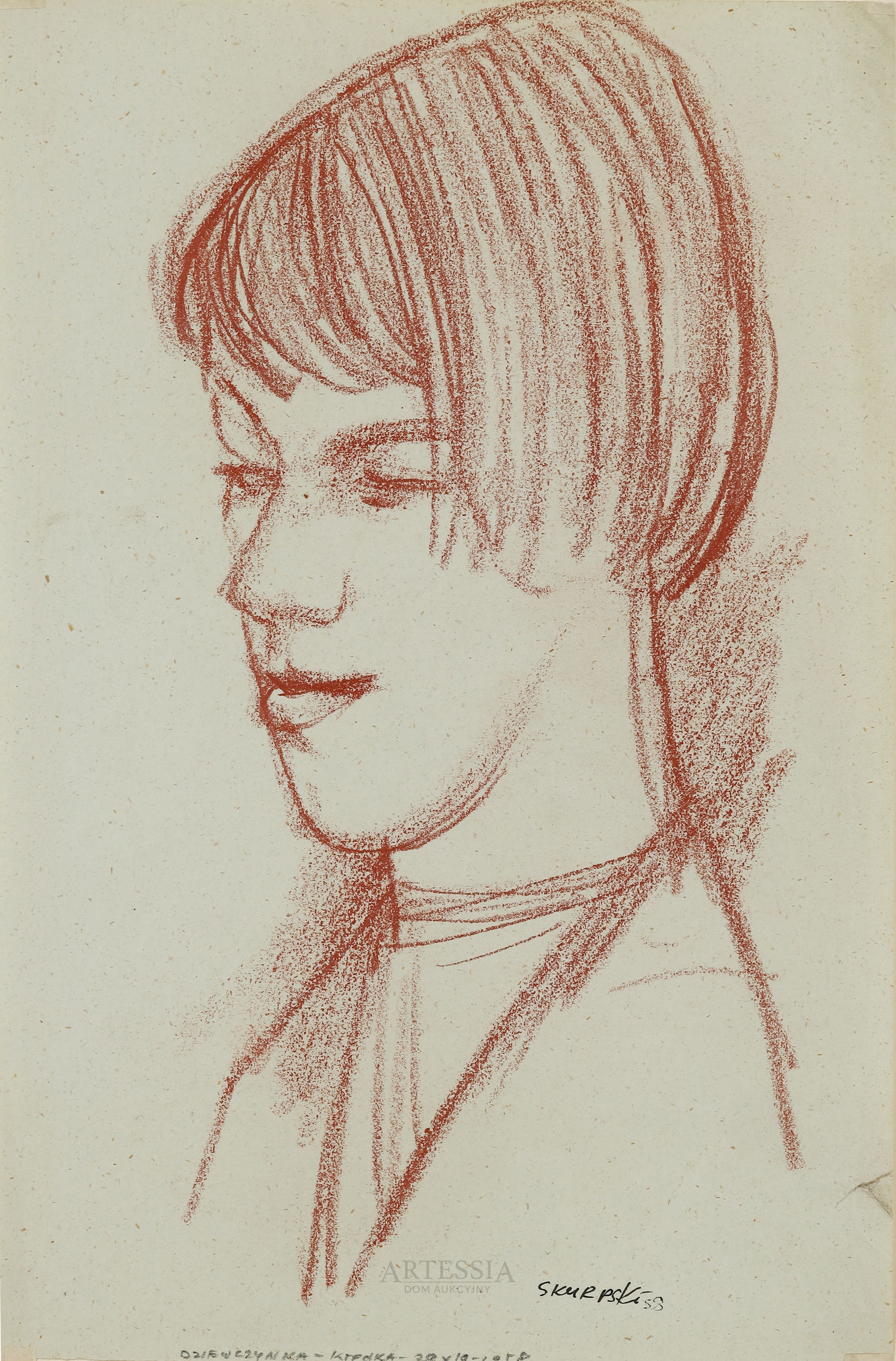 kredka/ papier, 29x19 cm,sygn. i dat. p.d.: Skurpski 58;poniżej dopisek: Dziewczynka – kredka – 29x19-1958