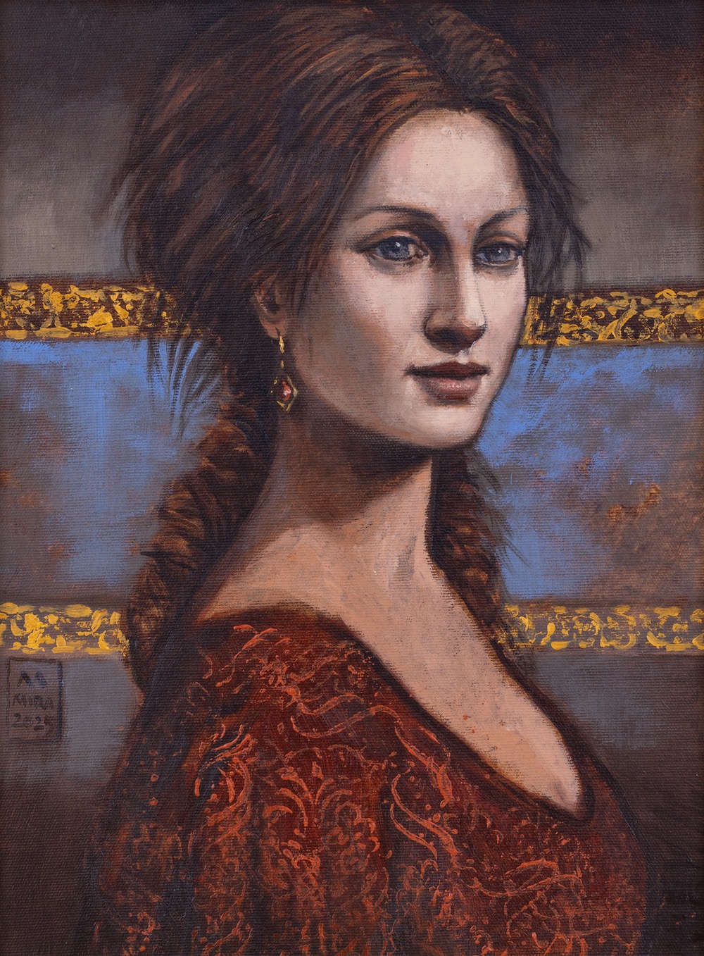 olej, płótno , 40 x 30 cm (w oprawie 58 x 48 cm), sygnowany l.d.: '[monogram M] | MIRA | 2025' oraz opisany na odwrocie: 'DZIŚ BĘDĘ ROZCZOCHRANA | 40 x 30 cm, OLEJ, 2025 | MIRA SKOCZEK-WOJNICKA | Mira'25'