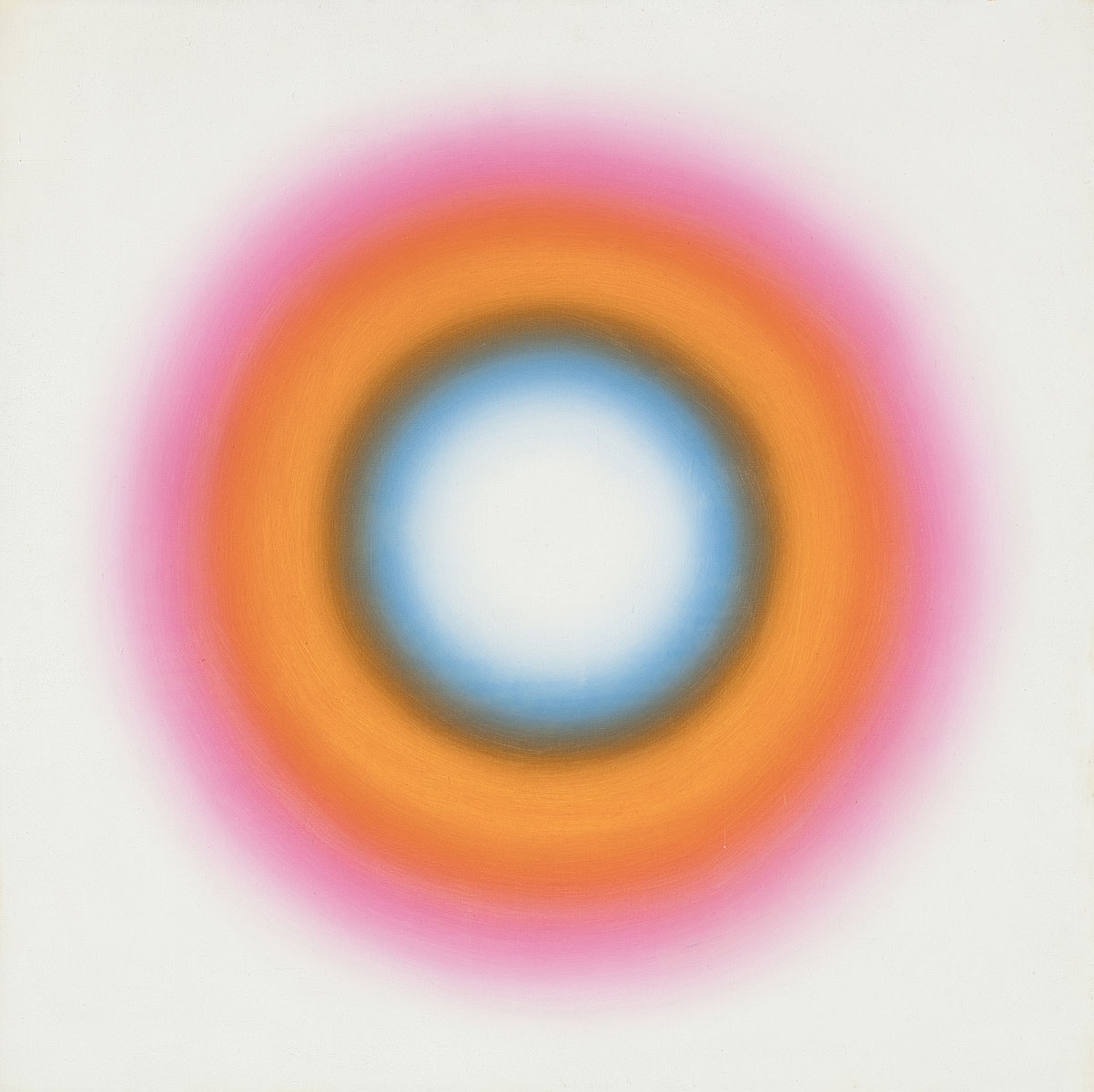 Powierzchnia obrazu została opracowana z niezwykłą precyzją: idealnie wygładzona, pozbawiona widocznych śladów pędzla, wzmacnia świetlistość i nasycenie barw. Kolorystyczne kręgi przekraczają granice płótna, jakby rozchodząc się jeszcze dalej – wciągając widza w przestrzeń pozamalarską i czyniąc go współtwórcą wizualnego doświadczenia. Obraz ten pozostaje jednym z najczystszych przykładów Fangorowskiej syntezy światła, koloru i ruchu, a zarazem świadectwem dojrzałości jego języka op-artu.
