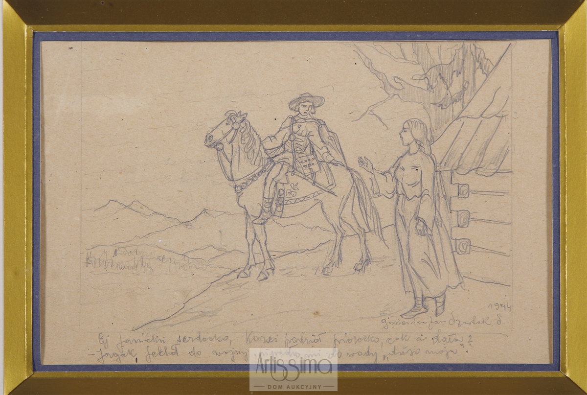 u dołu napisany przez autora cytat z piosenki: Ej, Jancku, serdecko, kaześ podział pióreczko, cok ci dała?/Jagiek jechoł do wojny, wpadło mi do wody, "dziso mojo".