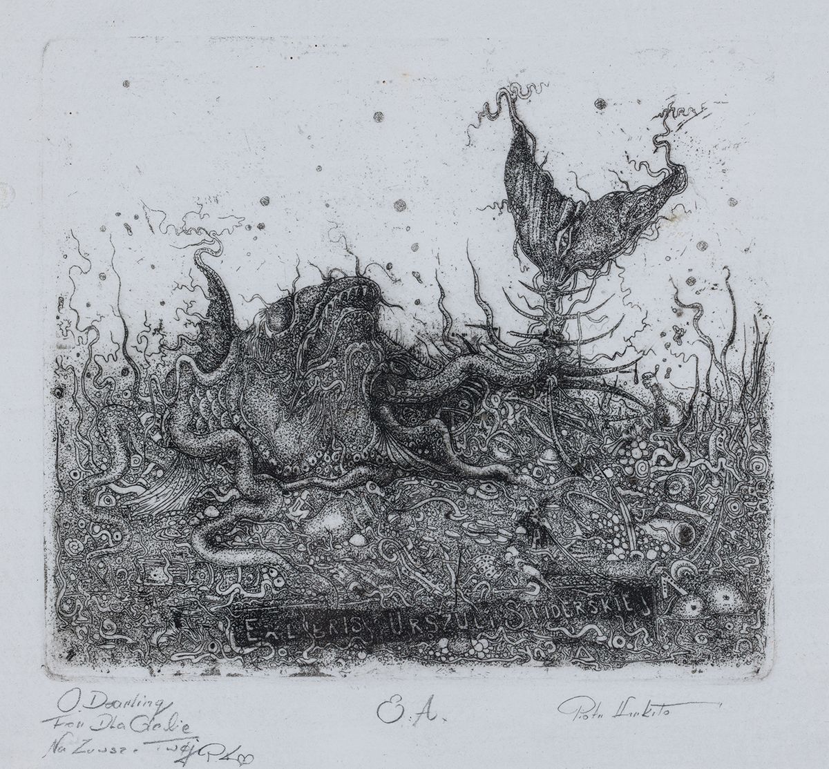 Akwaforta, akwatinta, papier; 10,8 x 12 cm (odcisk płyty) Sygnowany ołówkiem pod rycina: O dearling / For Dla Ciebie / Na Zawsze twój P.K. E. A. Piotr Kiriłło Na odwrocie dedykacja autorska Oprawiony