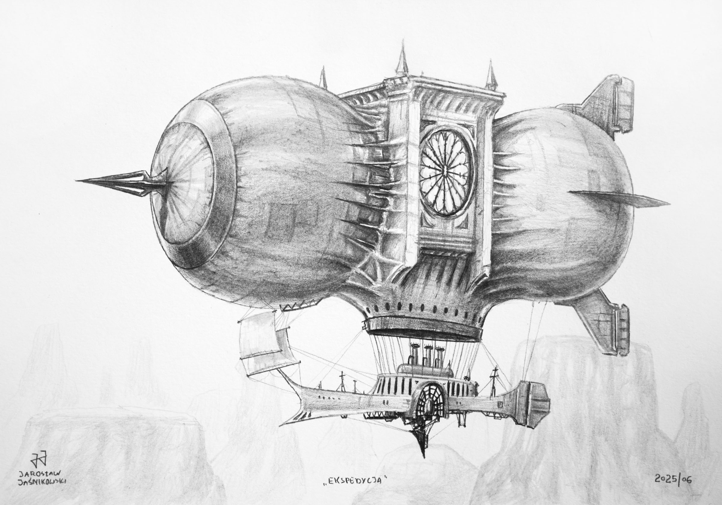 ołówek na papierze, 21 cm x 15 cm; sygn. w kompozycji, l.d.: J.J. JAROSŁAW JAŚNIKOWSKI; zatytułowany, śr.d.: ''Ekspedycja''; datowany, p.d.:2025 / 06; dołączony certyfikat autorski; rysunek oprawiony (w ramie: 37 cm x 30 cm)