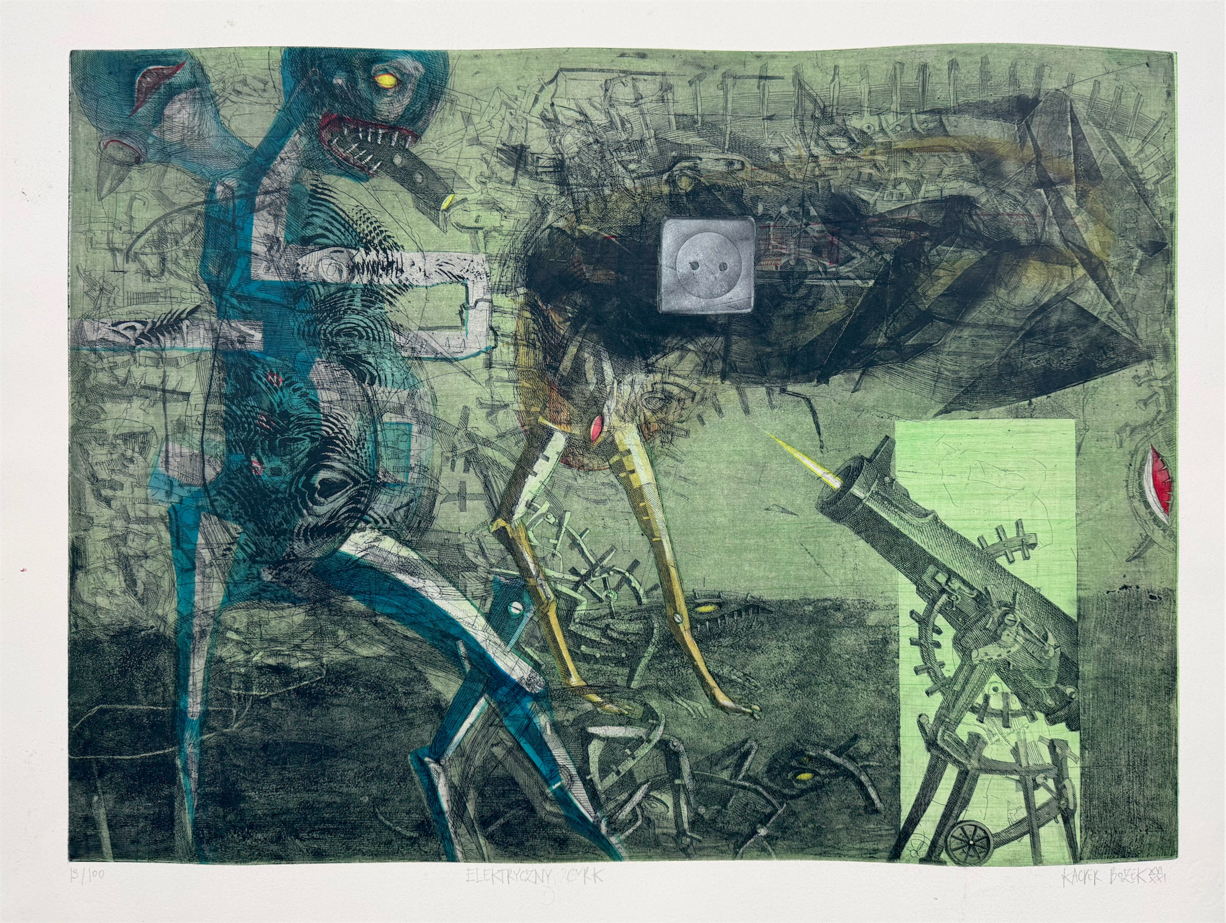 akwaforta, mezzotinta, sucha igła, papier,; 50 x 68,5 cm (odcisk płyty) 59 x 78,5 (arkusz); sygn. p. d.: KACPER BOŻEK XVI / XXI (ołówkiem), opisane śr. d.: ELEKTRYCZNY CYRK (ołówkiem) oraz numerowane l. d.: 13/100 (ołówkiem).