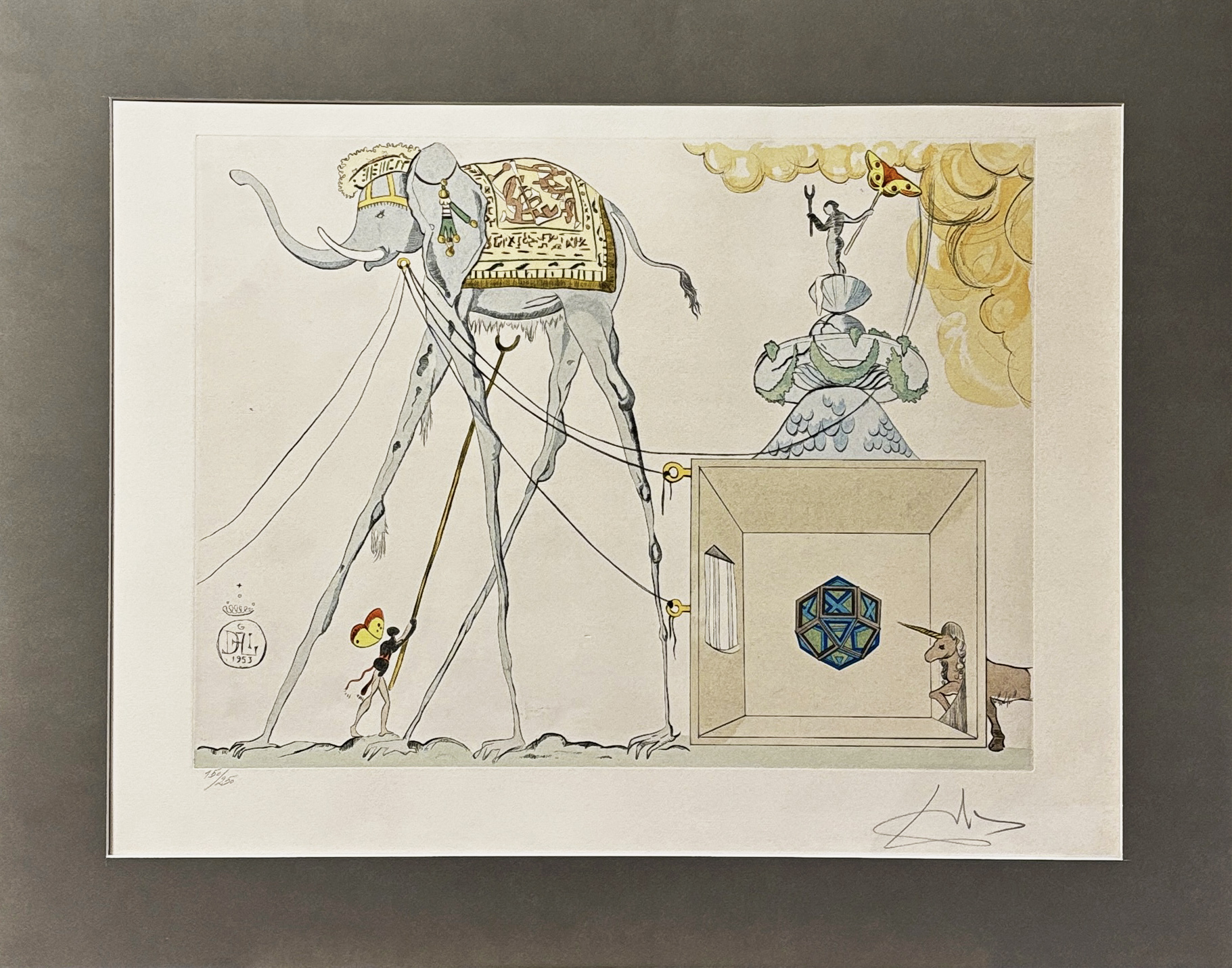 Kompozycja: Centralnym punktem jest słoń ciągnący prostopadłościenną konstrukcję, w której znajduje się niebieski wielościan oraz jednorożec.