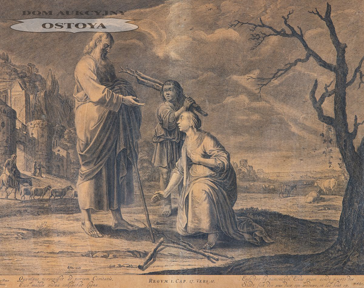 Miedzioryt papier; 39 x 48,5 cmSygnowany z płyty pod ryciną: Pieter Potter pinxit Regum 1 cap. 17 vers 10 P. Nolpe fec