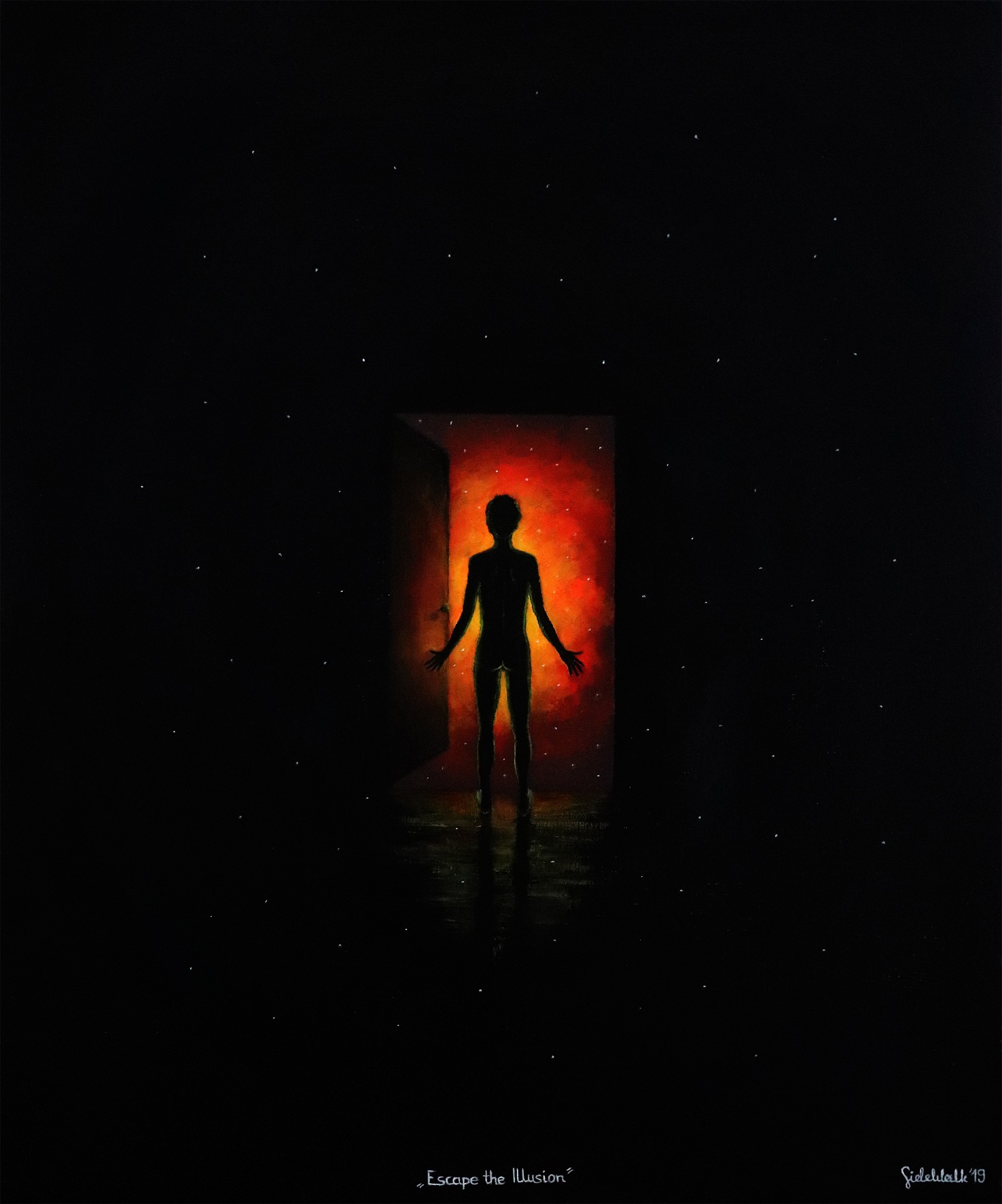 olej/płótno, 65 x 54 cm,sygnowany, datowany i opisany środek i pd: ' Escape the illusion | SideWalk 19 '