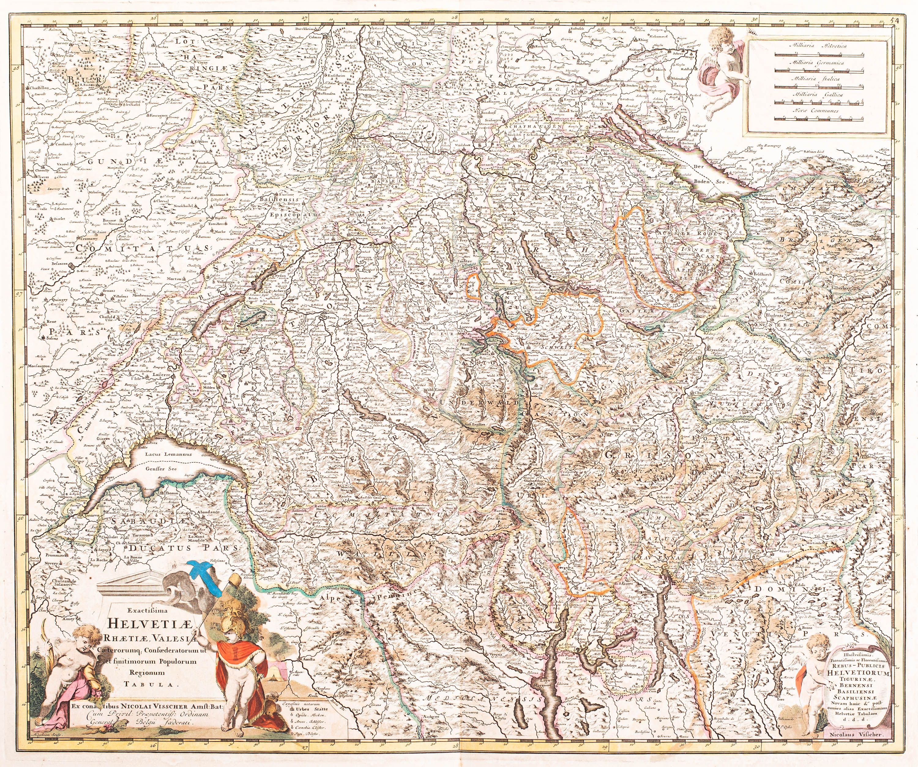 Mapa Szwajcarii, ok. 1680miedzioryt kolorowany w epoce, 48 x 58 cm (odcisk płyty)stan zachowania: zbrązowienie papieru, dwa niewielkie naderwania papieru w obrębie dolnego marginesu