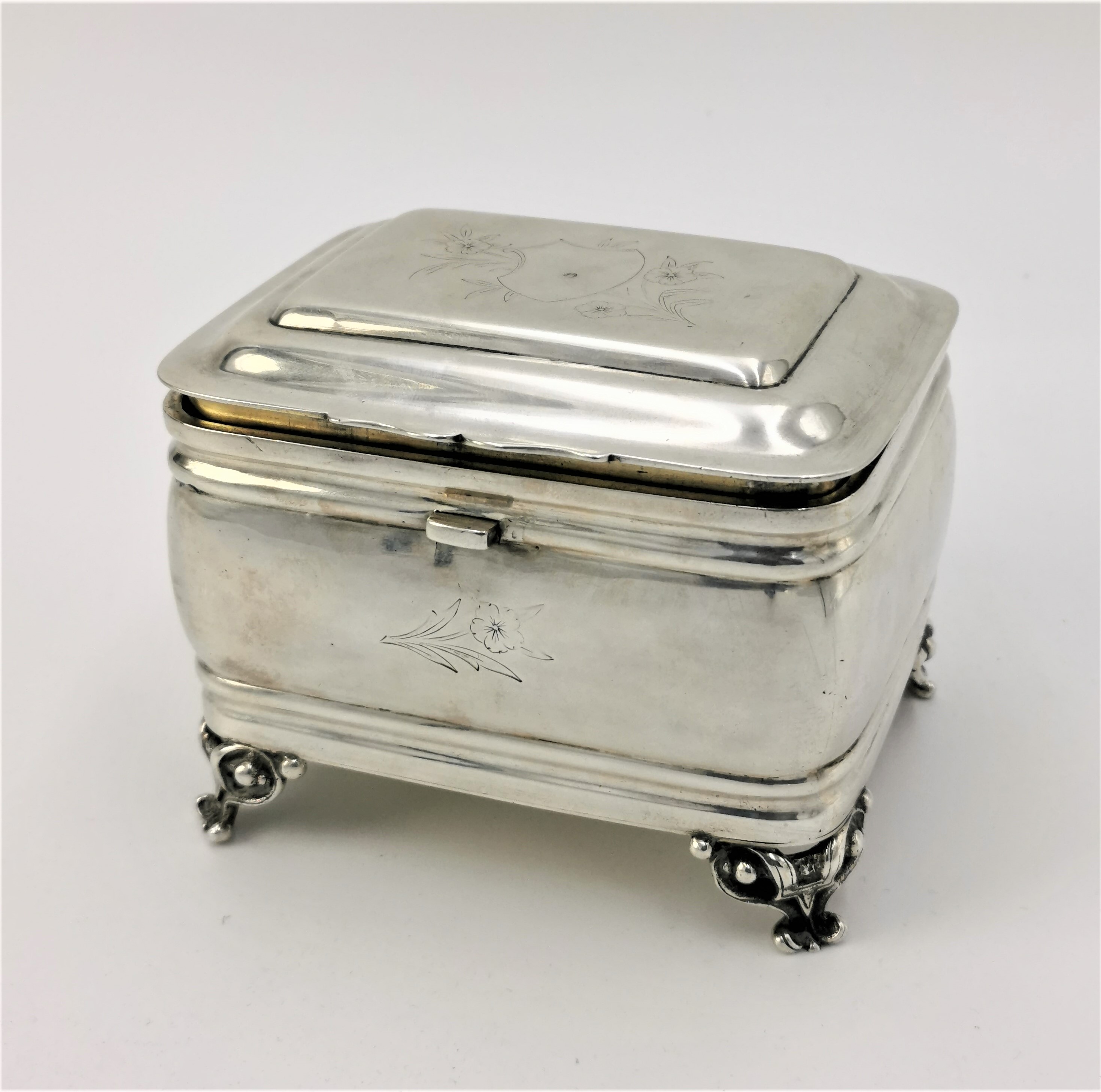 Prostopadłościenna z wyoblonymi narożami, ujęta u dołu i u góry w gładkie półwałki, od frontu pod górną krawędzią zdobiona grawerowanym kwiatkiem na łodyżce; nakrywka na zawiasie, zamykana na zatrzask, uskokowo wywyższona, płaska, z grawerowanym ślepym kartuszem dekorowanym motywem kwiatków.