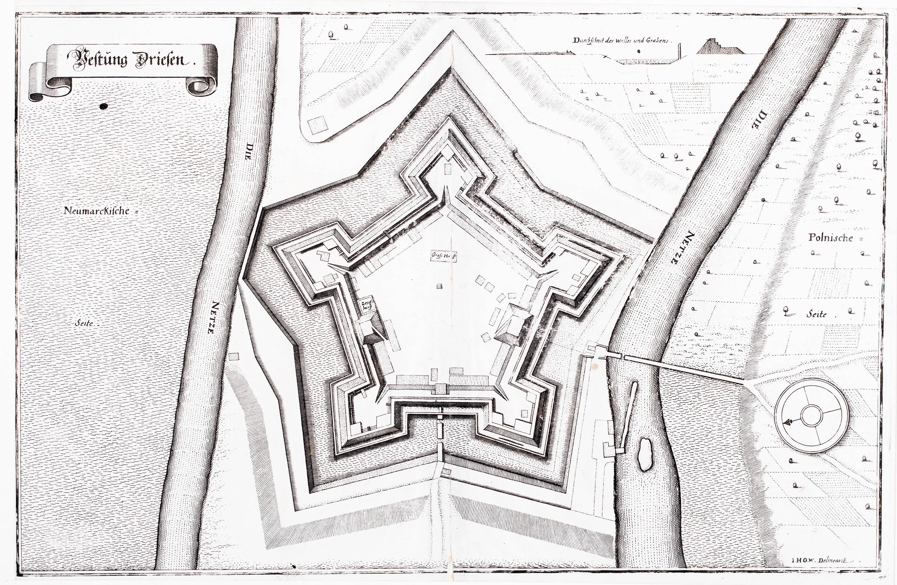 Plan twierdzy Drezdenko, Frankfurt n. Menem, ok. 1650miedzioryt, 23,3 x 35,6 cm (odcisk płyty)stan zachowania: miejscowe rozdarcia na linii złożenia