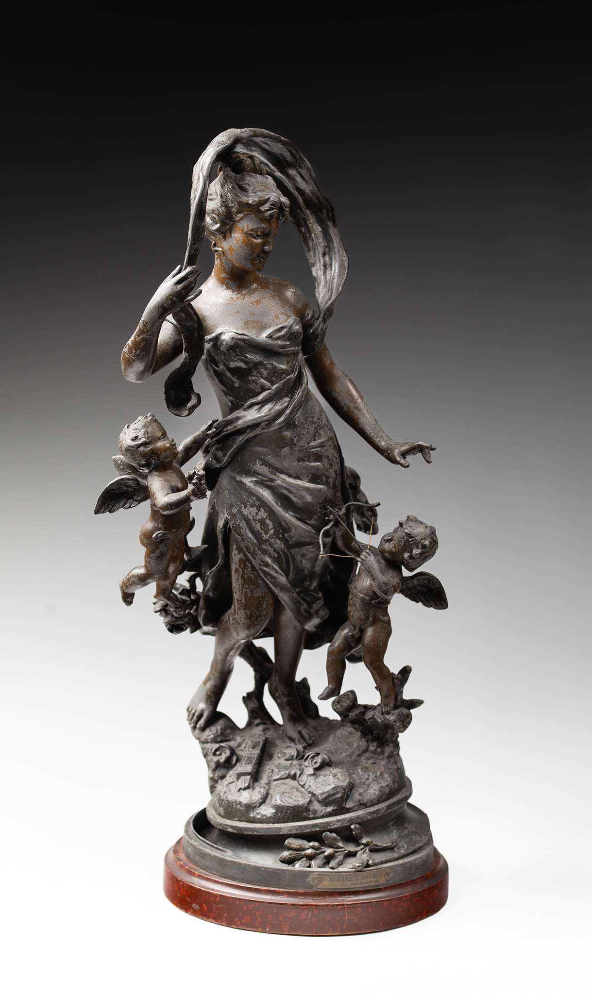 Stan zachowania: przetarcia i odpryski patyny, wgnieciona i pęknięta podstawa.