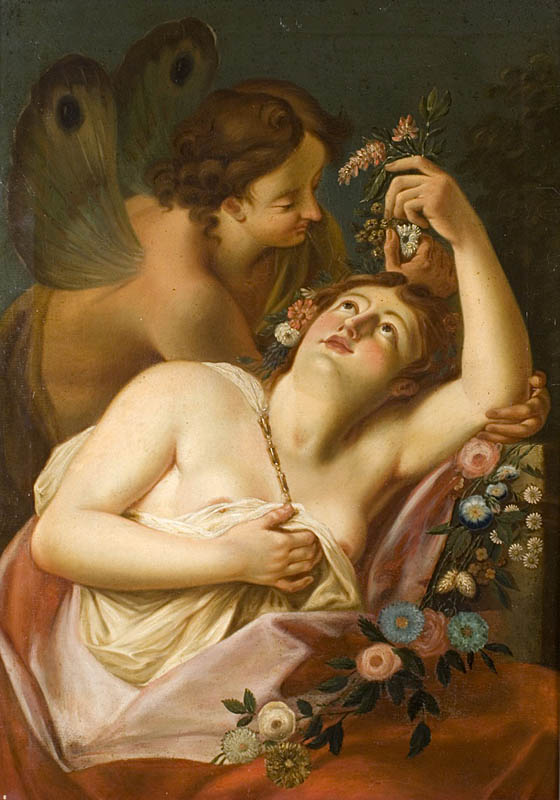 Obraz powstał na przełomie XVIII i XIX stulecia. Temat Flory i Zefira należał do popularnych przedstawień mitologicznych w całym okresie nowożytnym. Historię miłości Zefira, bożka łagodnego, zachodniego wiatru do nimfy Flory opisał Owidiusz w swym niedokończonym utworze "Fasti"(V, 200-206). Pojawienie się Flory zwiastowało przyjście wiosny, rozkwit kwiecia na polach, łąkach i w ogrodach. Zefir poślubił Florę i podarował jej władzę nad światem kwiatów. W niniejszej kompozycji, Zefir przyozdabia nimfę girlandą z wielobarwnych kwiatów. Interesujące jest połączenie tych postaci w pionowej kompozycji oraz nadanie całej scenie bardzo zmysłowego charakteru. Atrybucja dzieła znakomitemu malarzowi Janowi Kupecky`emu nie jest uzasadniona.