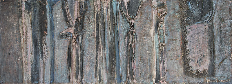 collage, olej, tektura prasowana,44,5 × 121 cmsygn. p. d.: JMuszanka Łakomska; na odwrocie naklejka z opisem autorskimPraca z kolekcji rodzinnej