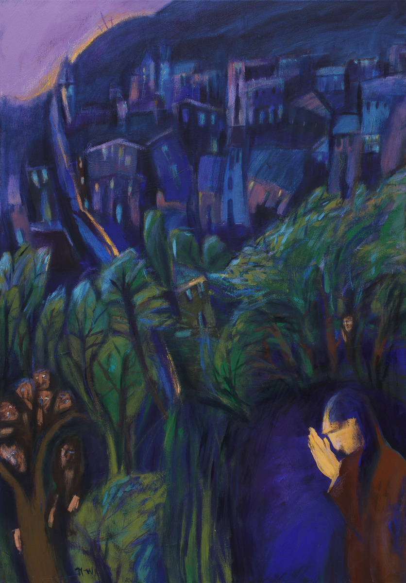 technika mieszana, olej, akryl, płótno, 100x70 cm, sygn.l.d.: n-w, opisany na odwrocie: natalia nasada-wojtal Getsemani 2020