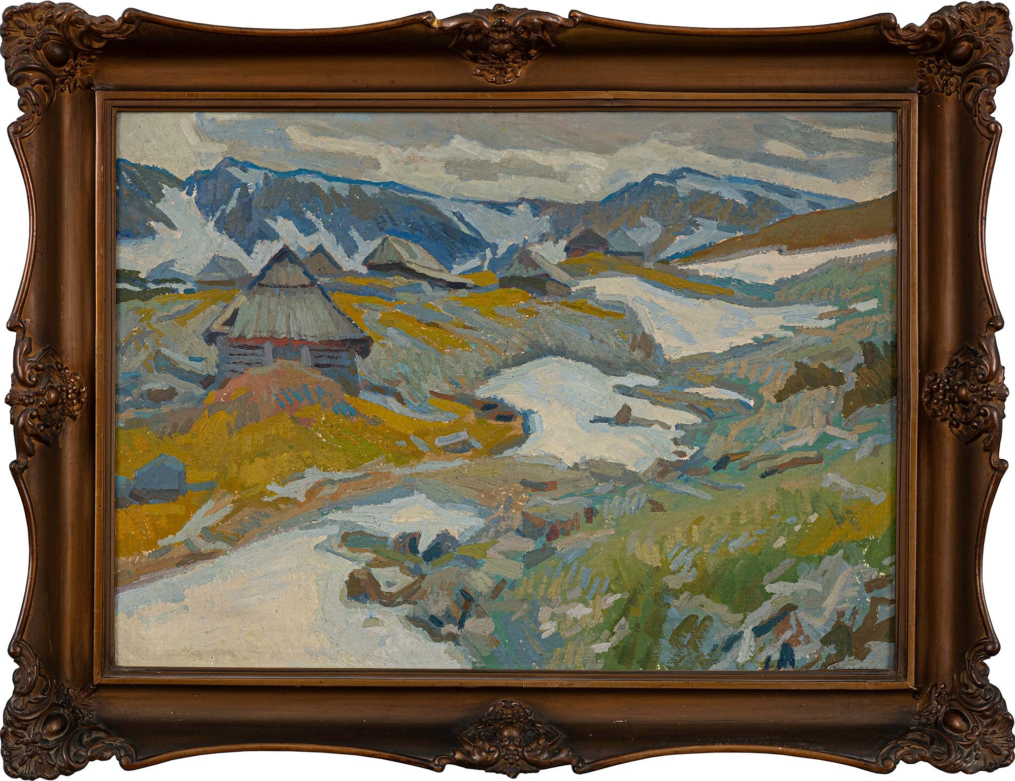 Szerokie pociągnięcia pędzla, rozległe plamy koloru rozlewające się swobodnie po podłożu i zastosowanie chłodnej gamy kolorystycznej, tworzą wyjątkowo dekoracyjny, przedwiosenny pejzaż. Artysta przedstawił tatrzańską halę z charakterystycznymi bacówkami, jako spójną, doskonale współgrającą ze sobą przestrzeń. Kolekcjonerzy twórczości tego utytułowanego pejzażysty, z pewnością docenią także nalepki dokumentujące historię dzieła, jak choćby nalepkę Towarzystwa Przyjaciół Sztuk Pięknych w Krakowie.