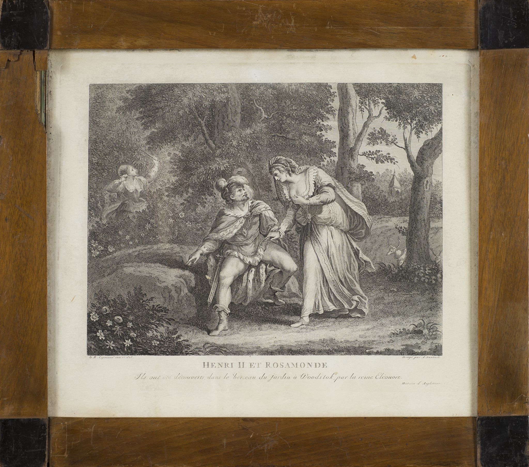 Miedzioryt, 26,5 x 31 cm, sygn. l.d.: G. B. Cipriani Inv. et. del., p.d.: Dirigé par A. Suntach, ś.d.: HENRI II. ET ROSAMONDE / Ils ont été découverts, dans le berceau du jardin à Woodstock, par la reine Eleonore, p.d.: Histoire d'Angleterre,