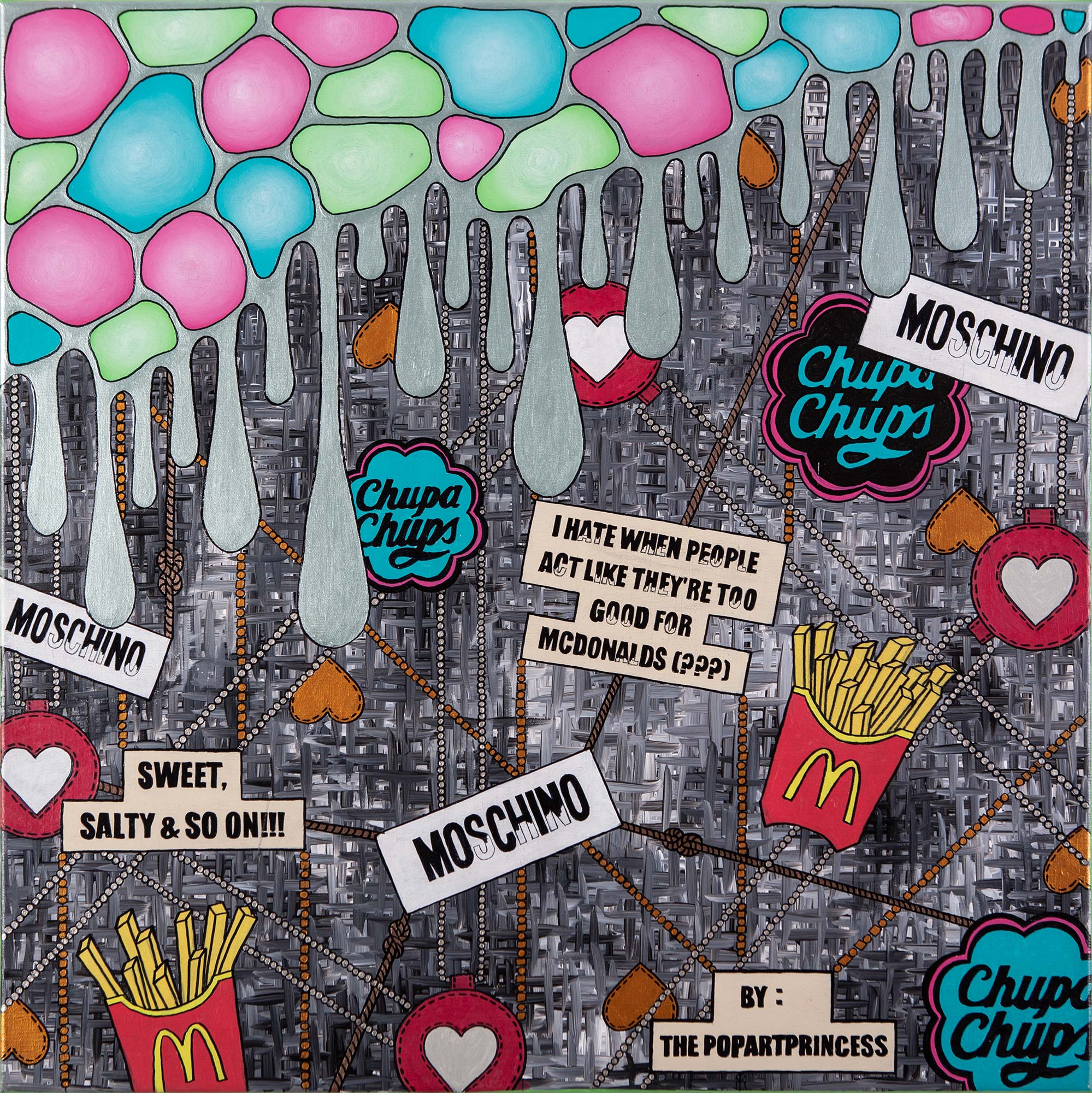 Sygn. na odwrocie: ,,I Hate When (...)” 2022/ ,,Consumerism of 21st Century” Saves with ,,Cells” Motives ThePopArtPrincess/ MajaAleksandraGackowska/ 70x70cm/ Acrylic on Canvas