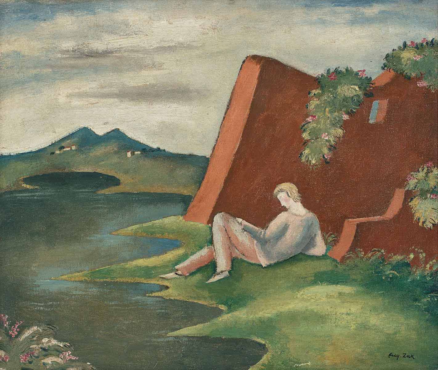 Oferowany obraz „Idylla - Krajobraz z leżącym młodzieńcem, ok. 1915” wpisuje się doskonale w powyższą charakterystykę. Na tle sielankowego pejzażu w stylu włoskim czy południowo-francuskim umieszczona została męska postać o typowym dla Zaka wyglądzie, lekko nawiązującym do stylistyki quattrocenta. Melancholia i nostalgia przedstawienia wciągają widza w krainę bezczasowości, spokoju i marzeń sennych. Wrażenie to potęguje gama subtelnych tonów zieleni, błękitów i brązów, a także finezyjny, miękki kontur. Kompozycje z cyklu idyllicznego artysty, jak zwykło się je nazywać, należą od lat do najbardziej cenionych i poszukiwanych.