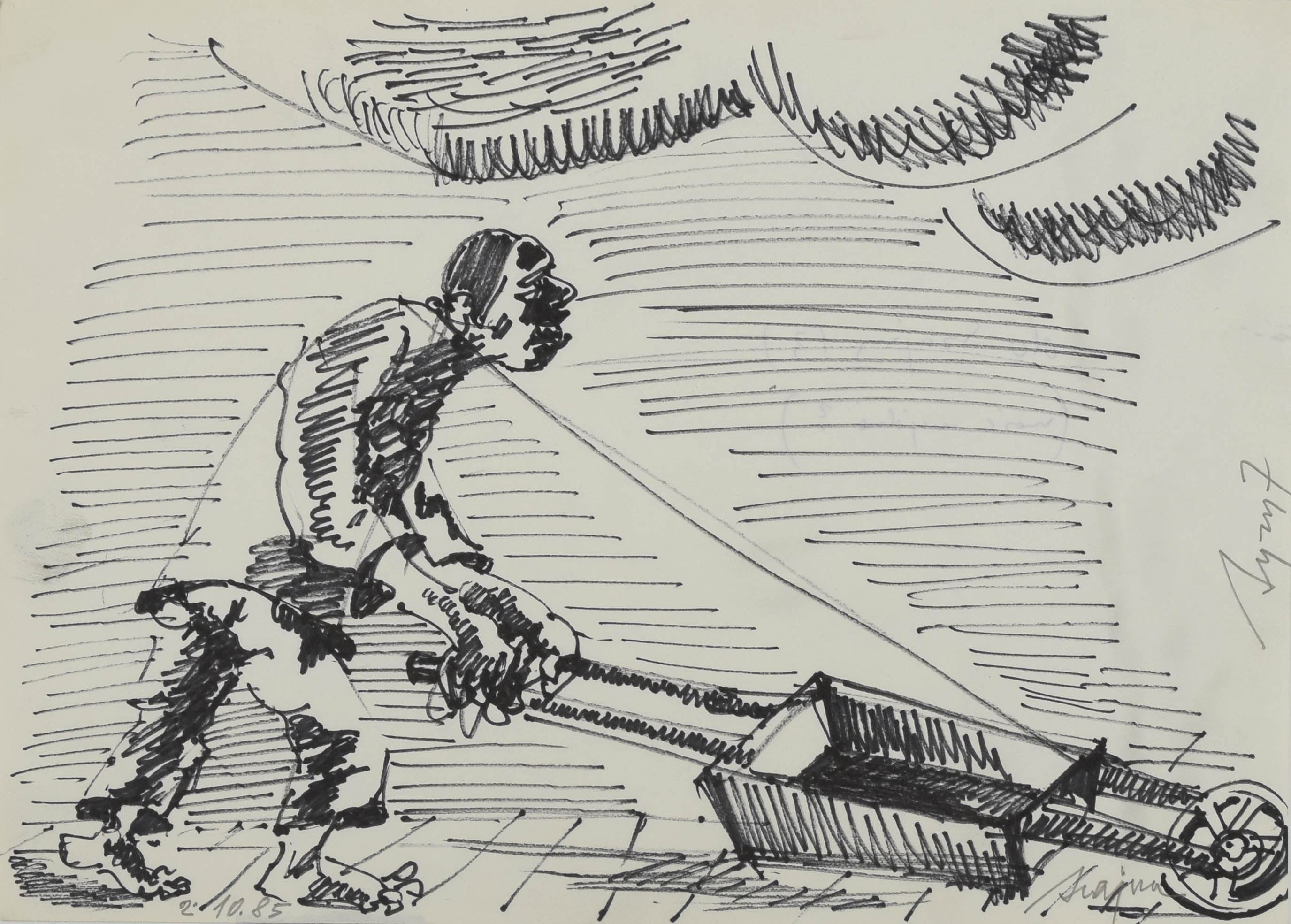 flamaster, papier; 21 x 30 cm;sygn. p. d.: JSzajna; data l. d.: 2.10.85; napis wzdłuż prawej krawędzi: Syzyf;na odwrocie napis niebieskim długopisem: do Szajny (3) / (może wejdzie ?).