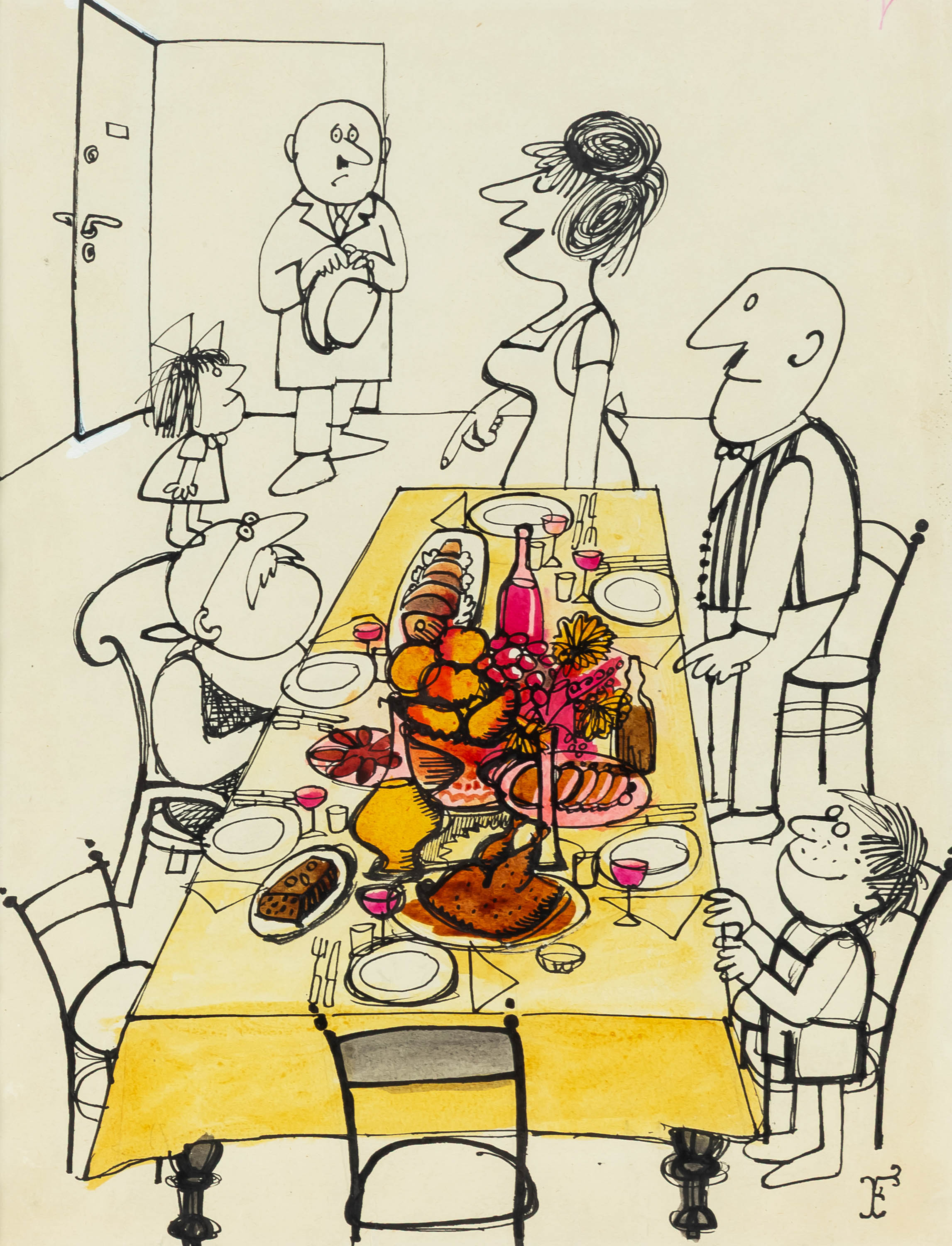 tusz, akwarela, 39 x 29,5 cm, sygn. p.d. monogramem wiązanym, na odwrocie uwagi typograficzne oraz podpis: "Imieniny? Nie, czekamy na hydraulika". Rysunek umieszczony w "Szpilkach" 45/1964.