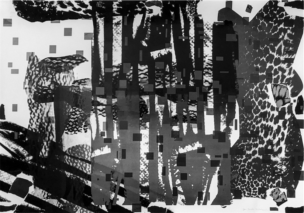 Monotypia, kolaż E/U, farba sitodrukowa, papier (odbitka pojedyńcza (drugiej takiej samej nie ma) zrobiona na podstawie sitodruku), 70x100 cm