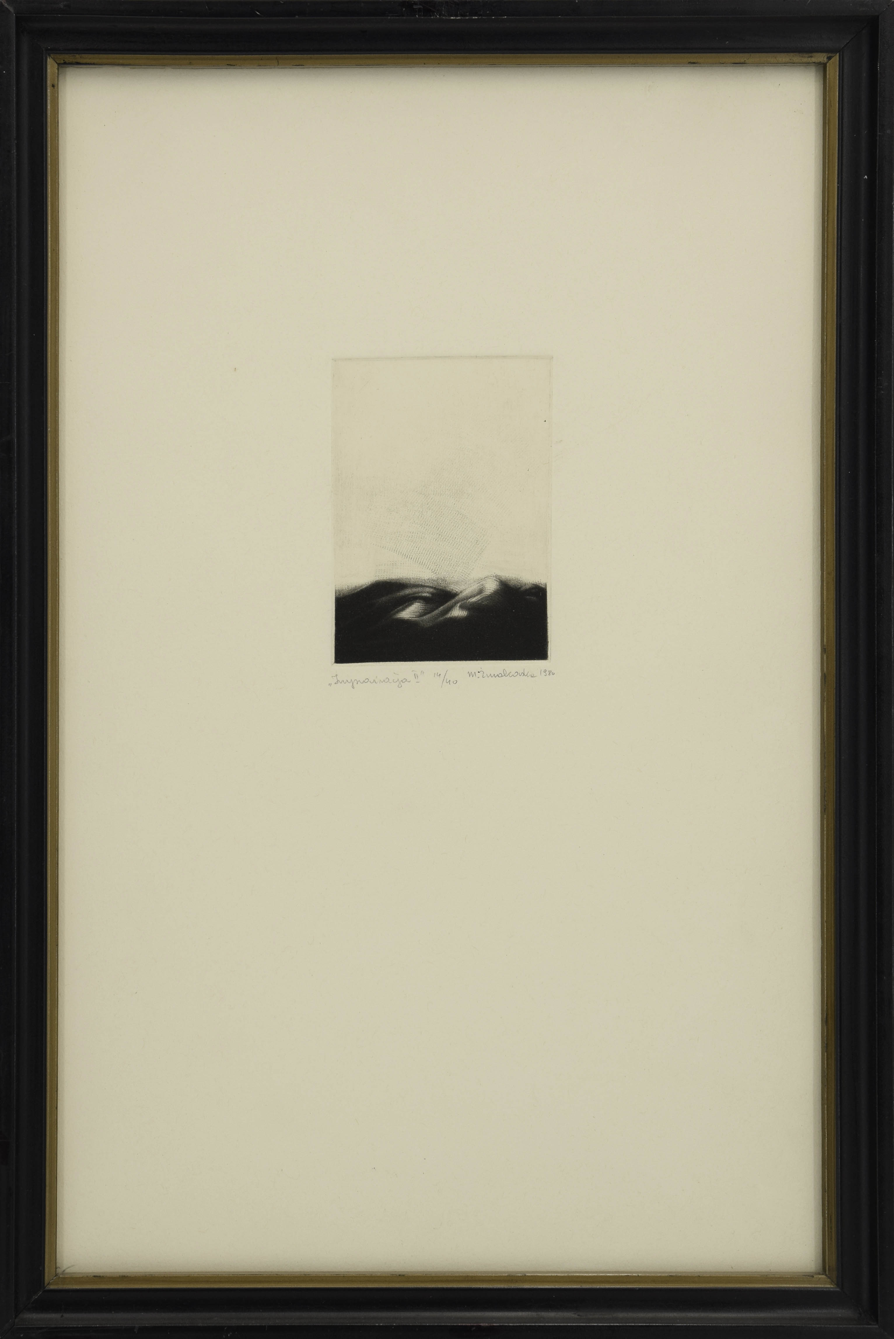 mezzotinta, papier, 9,7 x 6,8 cm (odcisk płyty), 38 x 24 cm (wymiar arkusza w świetle oprawy); opis autorski pod odbitką: "Improwizacja II" 14/40 M. Żurakowska 1980 (ołówkiem)