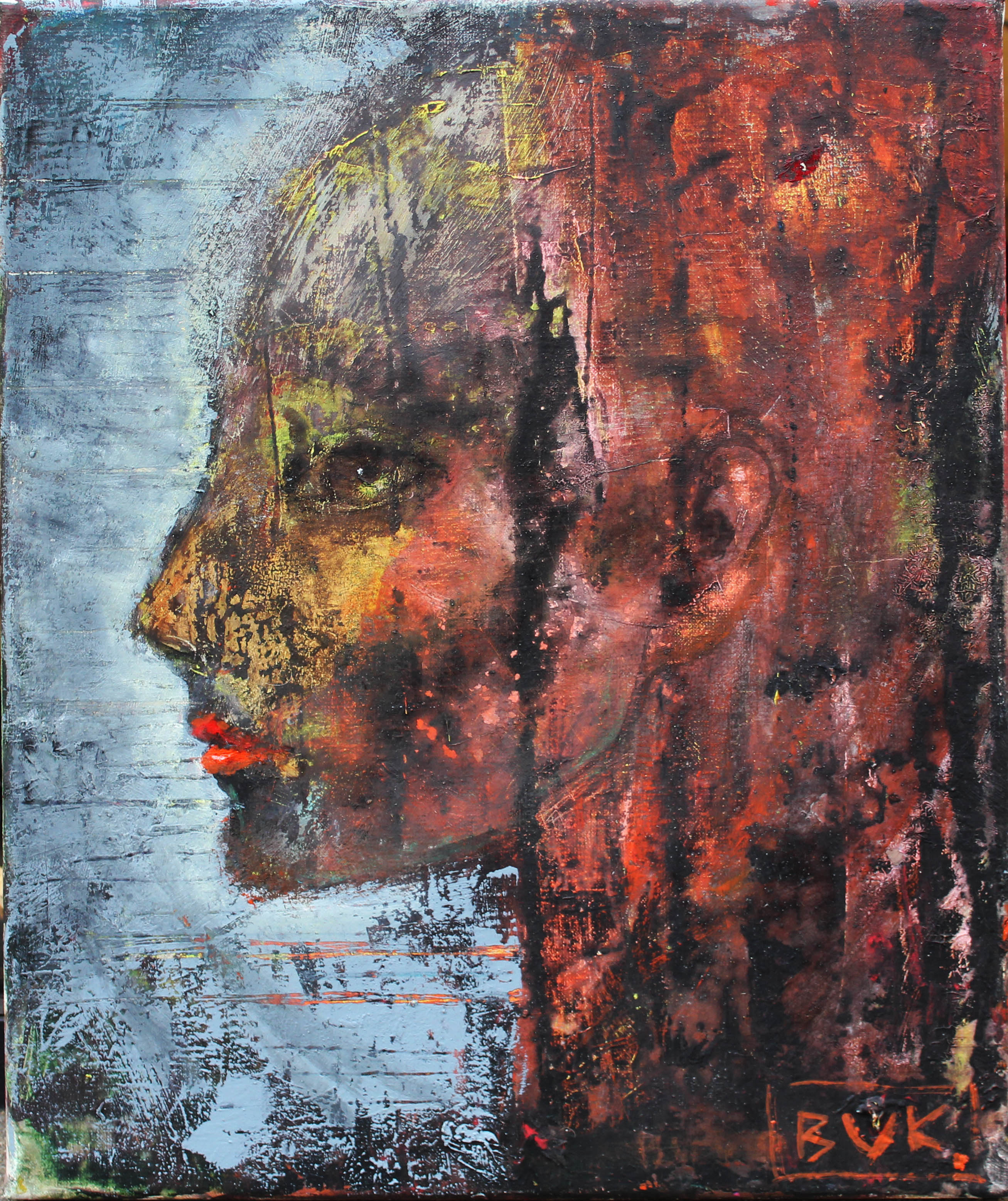 technika mieszana/płótno, 50 x 40 cm,sygnowana p. d.: ‘Buk.’,sygnowana, datowana i opisana na odwrociu: ‘Inoplanietianka |2019 | Olga | Bukowska’