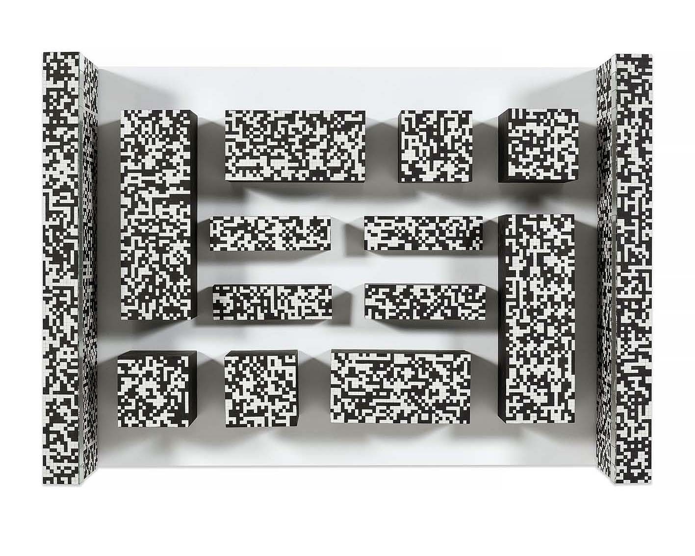 Jednym z rezultatów tych eksperymentów jest prezentowany, kolekcjonerski unikat. Monumentalna kompozycja, złożona z czternastu prostopadłościennych brył, łączy charakterystyczny dla artysty proces twórczy oparty na rachunku prawdopodobieństwa i klasycznym kontraście czerni i bieli z nowatorskim zastosowaniem elementów lustrzanych, które multiplikują obraz i włączają w dzieło otaczającą przestrzeń. Prace z wykorzystaniem luster Winiarski zaprezentował po raz pierwszy podczas Sympozjum Plastycznego we Wrocławiu w 1971 roku, otwierając nowy etap w swojej twórczości.
